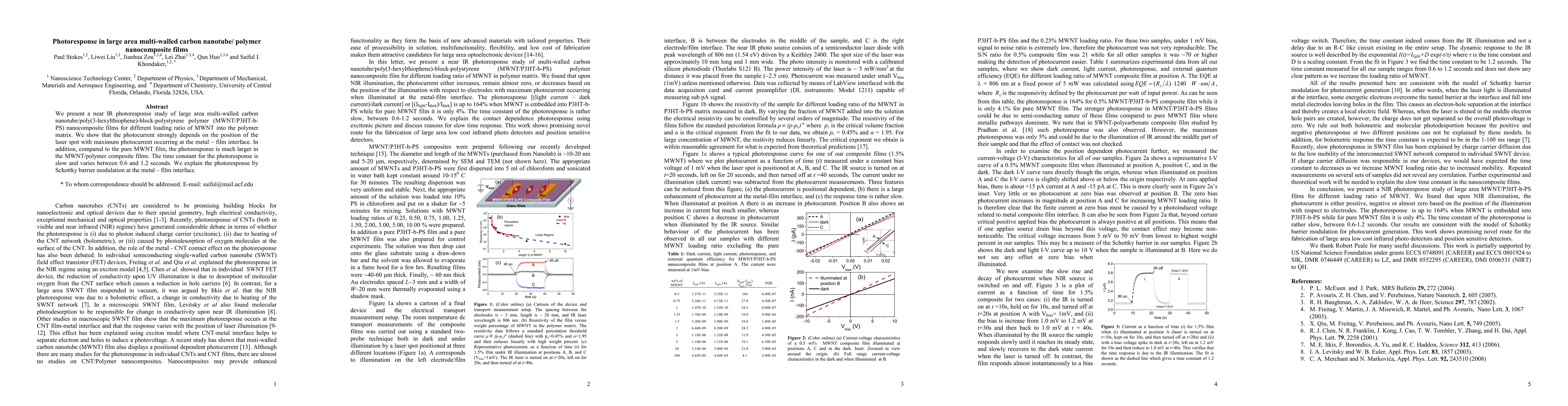 This research investigates the near IR photoresponse of large area multi-walled carbon nanotube/polymer nanocomposite films, showing enhanced photocurrent compared to pure MWNT films, particularly at the metal-film interface, attributed to Schottky barrier modulation. The photoresponse time constant ranges from 0.6 to 1.2 seconds.