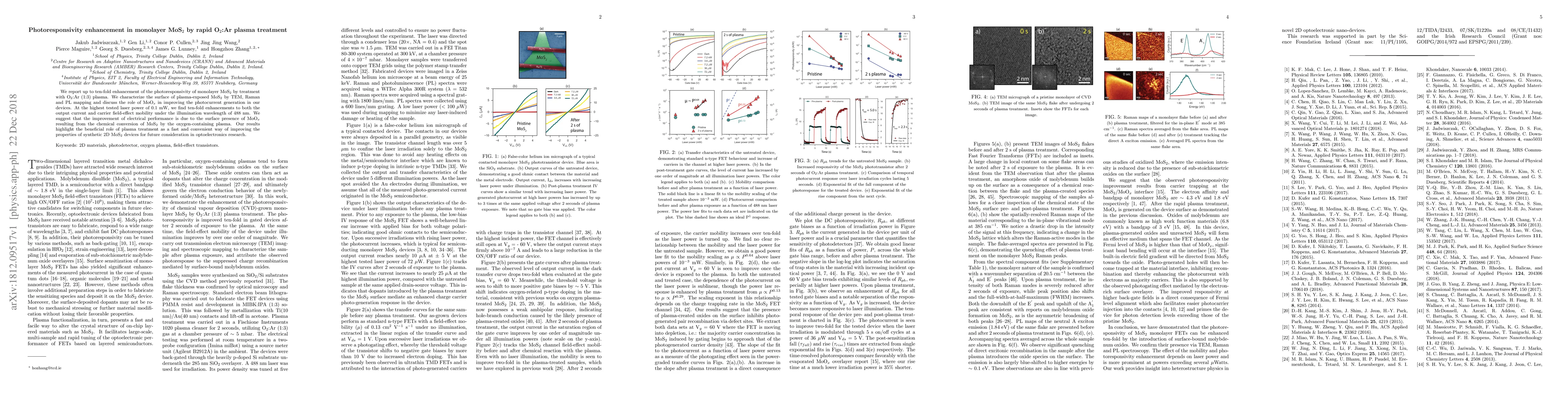This paper demonstrates a ten-fold increase in photoresponsivity of monolayer MoS$_2$ via O$_2$:Ar plasma treatment, attributing the enhancement to the formation of MoO$_x$ on the surface. The improved electrical performance is evidenced by increased output current and carrier mobility under 488 nm illumination.