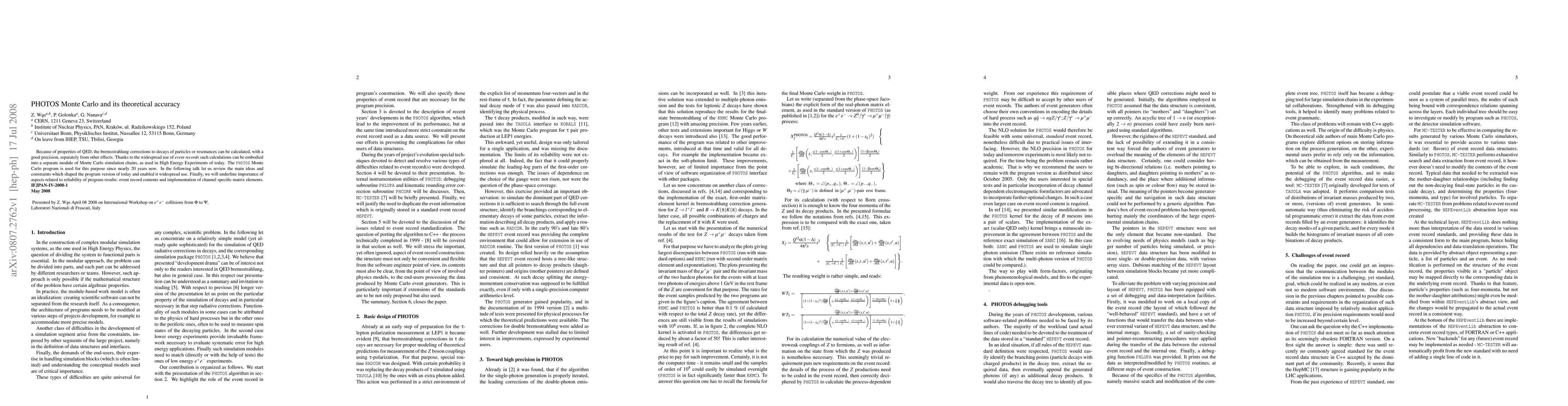 A 20-year-old Monte Carlo program, PHOTOS, accurately calculates QED effects in particle decays, enabling widespread use in high-energy experiments. Its reliability relies on accurate event records and channel-specific matrix elements.
