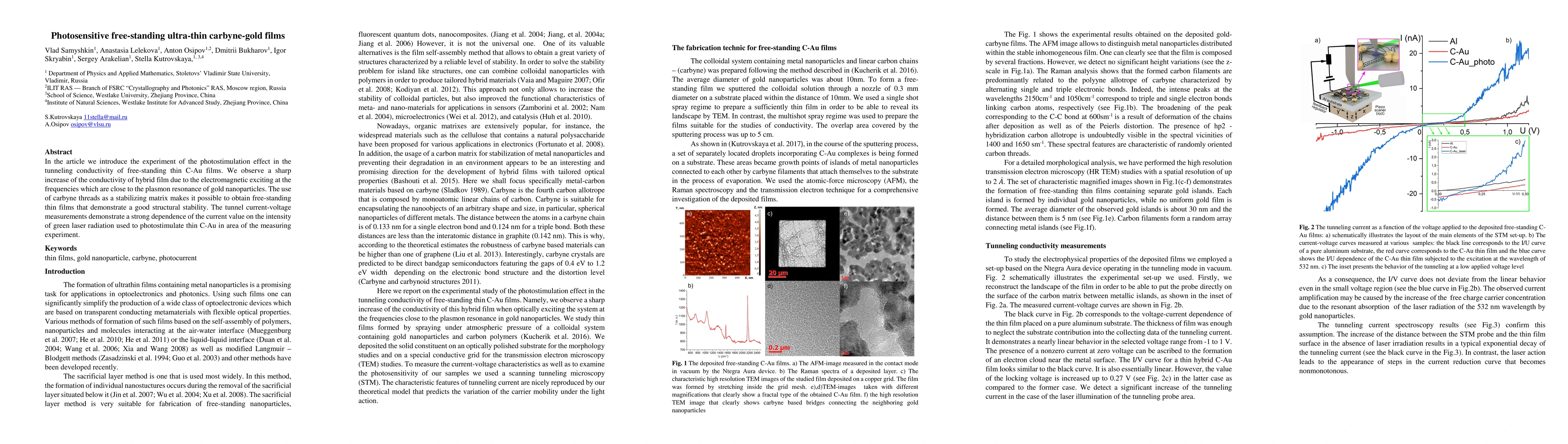 In the article we introduce the experiment of the photostimulation effect in the tunneling conductivity of free-standing thin C-Au films. We observe a sharp increase of the conductivity of hybrid film due to the electromagnetic exciting at the frequencies which are close to the plasmon resonance of gold nanoparticles. The use of carbyne threads as a stabilizing matrix makes it possible to obtain free-standing thin films that demonstrate a good structural stability. The tunnel current-voltage measurements demonstrate a strong dependence of the current value on the intensity of green laser radiation used to photostimulate thin C-Au in area of the measuring experiment.