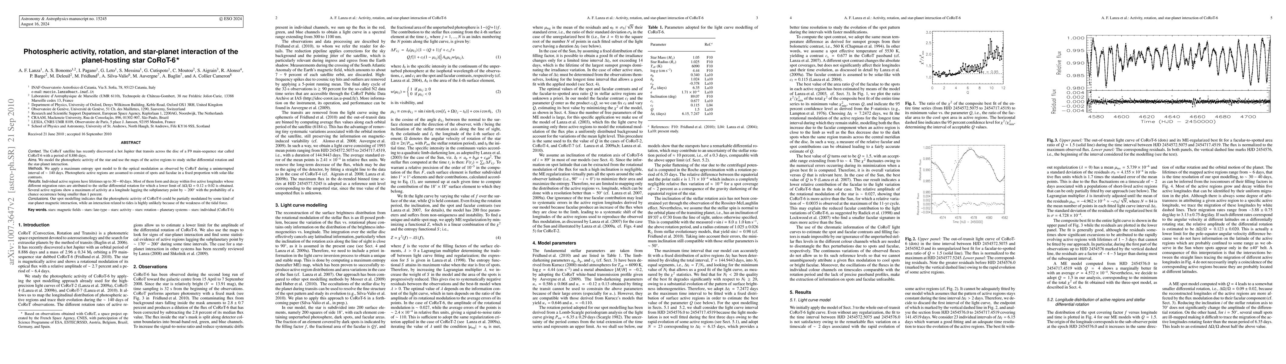 This paper models the photospheric activity of the F9V star CoRoT-6, hosting a hot Jupiter, using a maximum entropy spot model to analyze differential rotation and star-planet interaction. The study finds evidence of a star-planet magnetic interaction, while ruling out tidal forces due to the planet.