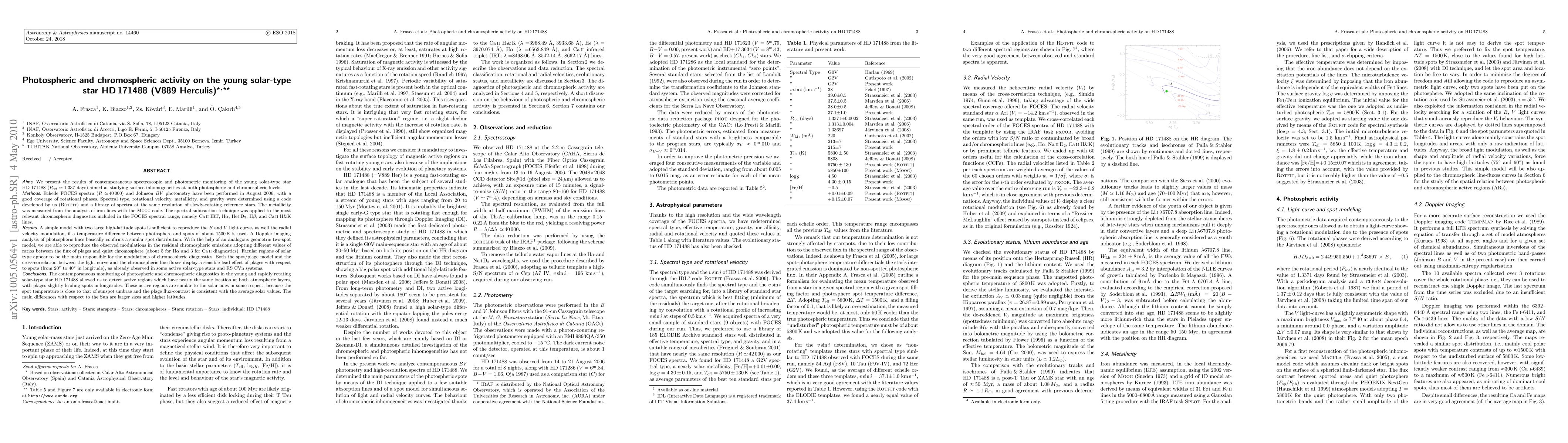 This study investigates the young solar-type star HD171488, finding it has similar active regions to the Sun with larger sizes and higher latitudes, while also exhibiting a lead effect of plage emissions preceding spot activity.