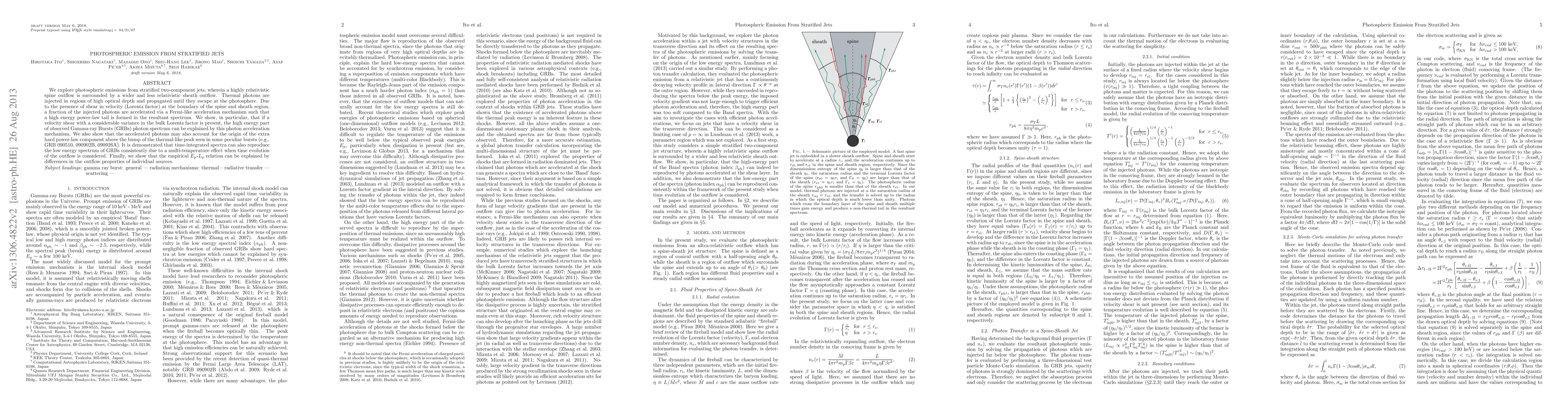 We explore photospheric emissions from stratified two-component jets, wherein a highly relativistic spine outflow is surrounded by a wider and less relativistic sheath outflow. Thermal photons are injected in regions of high optical depth and propagated until they escape at the photosphere. Due to the presence of shear in velocity (Lorentz factor) at the boundary of the spine and sheath region, a fraction of the injected photons are accelerated via a Fermi-like acceleration mechanism such that a high energy power-law tail is formed in the resultant spectrum. We show, in particular, that if a velocity shear with a considerable variance in the bulk Lorentz factor is present, the high energy part of observed Gamma-ray Bursts (GRBs) photon spectrum can be explained by this photon acceleration mechanism. We also show that the accelerated photons may also account for the origin of the extra hard power-law component above the bump of the thermal-like peak seen in some peculiar bursts (e.g., GRB 090510, 090902B, 090926A). It is demonstrated that time-integrated spectra can also reproduce the low energy spectrum of GRBs consistently due to a multi-temperature effect when time evolution of the outflow is considered. Finally, we show that the empirical Ep-Lp relation can be explained by differences in the outflow properties of individual sources.