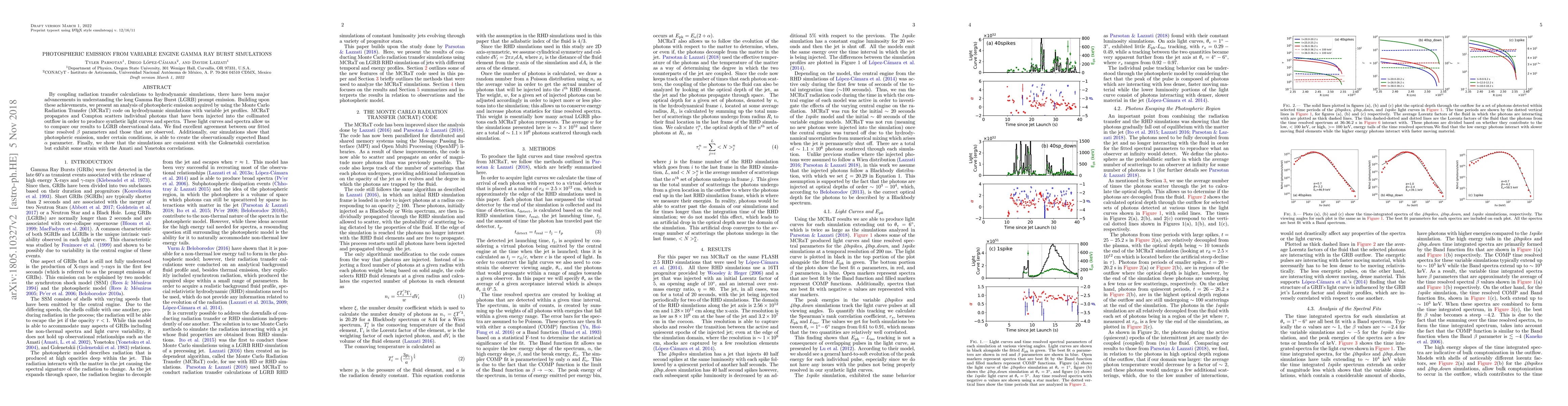 This paper uses Monte Carlo Radiation Transfer (MCRaT) to simulate photospheric emission from variable jet profiles in Gamma Ray Burst (GRB) hydrodynamics, producing synthetic light curves and spectra that match observational data. The study finds good agreement between simulated and observed $\beta$ parameters and demonstrates that the simulations can reproduce the Band $\alpha$ parameter under certain conditions.