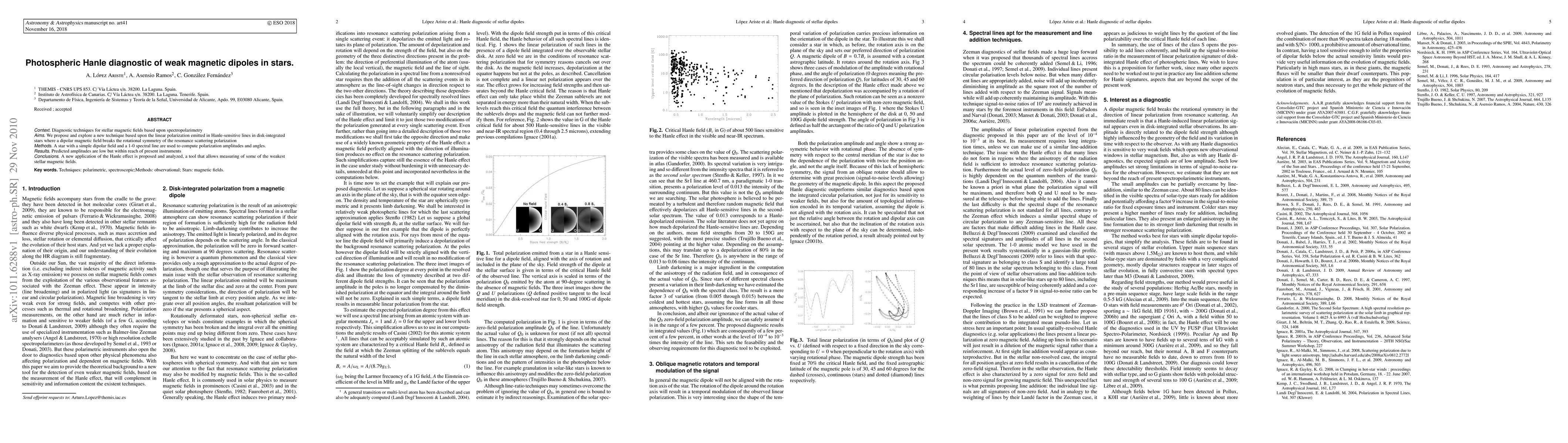 This paper introduces a novel spectropolarimetry technique to detect weak stellar magnetic dipoles using Hanle effect in photospheric lines, predicting feasible polarization amplitudes for current instruments. The method leverages the linear polarization from Hanle-sensitive lines in stars with dipolar magnetic fields.
