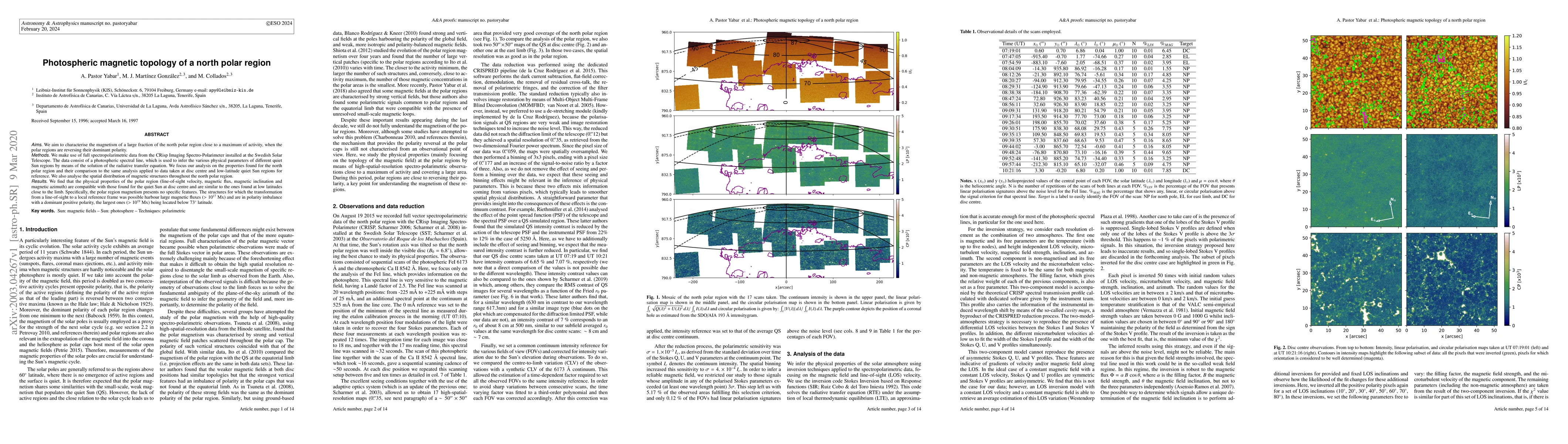 Aims. We aim to characterise the magnetism of a large fraction of the north polar region close to a maximum of activity, when the polar regions are reversing their dominant polarity. Methods. We make use of full spectropolarimetric data from the CRisp Imaging Spectro-Polarimeter installed at the Swedish Solar Telescope. The data consist of a photospheric spectral line, which is used to infer the various physical parameters of different quiet Sun regions by means of the solution of the radiative transfer equation. We focus our analysis on the properties found for the north polar region and their comparison to the same analysis applied to data taken at disc centre and low-latitude quiet Sun regions for reference. We also analyse the spatial distribution of magnetic structures throughout the north polar region. Results. We find that the physical properties of the polar region (line-of-sight velocity, magnetic flux, magnetic inclination and magnetic azimuth) are compatible with those found for the quiet Sun at disc centre and are similar to the ones found at low latitudes close to the limb. Specifically, the polar region magnetism presents no specific features. The structures for which the transformation from a line-of-sight to a local reference frame was possible harbour large magnetic fluxes ($>10^{17}$ Mx) and are in polarity imbalance with a dominant positive polarity, the largest ones ($>10^{19}$ Mx) being located below $73^{\circ}$ latitude.