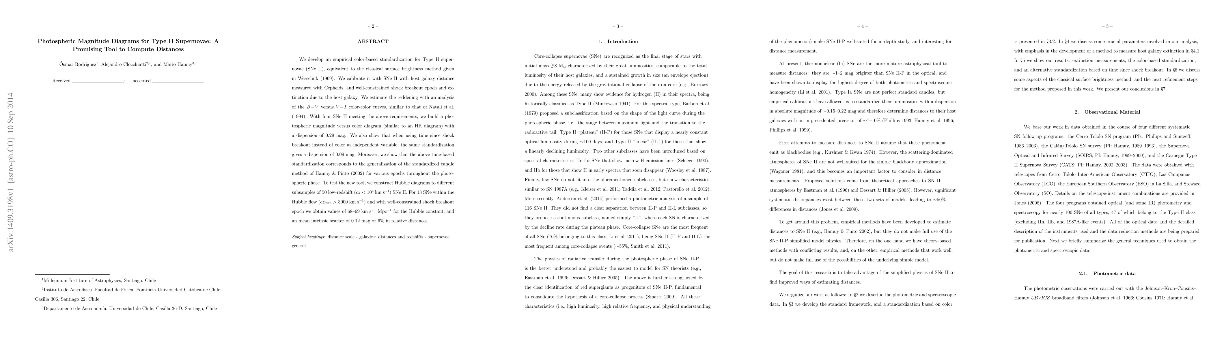 We develop an empirical color-based standardization for Type II supernovae (SNe II), equivalent to the classical surface brightness method given in Wesselink (1969). We calibrate it with SNe II with host galaxy distance measured with Cepheids, and well-constrained shock breakout epoch and extinction due to the host galaxy. We estimate the reddening with an analysis of the B-V versus V-I color-color curves, similar to that of Natali et al. (1994). With four SNe II meeting the above requirements, we build a photospheric magnitude versus color diagram (similar to an HR diagram) with a dispersion of 0.29 mag. We also show that when using time since shock breakout instead of color as independent variable, the same standardization gives a dispersion of 0.09 mag. Moreover, we show that the above time-based standardization corresponds to the generalization of the standardized candle method of Hamuy & Pinto (2002) for various epochs throughout the photospheric phase. To test the new tool, we construct Hubble diagrams to different subsamples of 50 low-redshift (cz<10^4 km s^-1) SNe II. For 13 SNe within the Hubble flow (cz_CMB>3000 km s^-1) and with well-constrained shock breakout epoch we obtain values of 68-69 km s^-1 Mpc^-1 for the Hubble constant, and an mean intrinsic scatter of 0.12 mag or 6% in relative distances.
