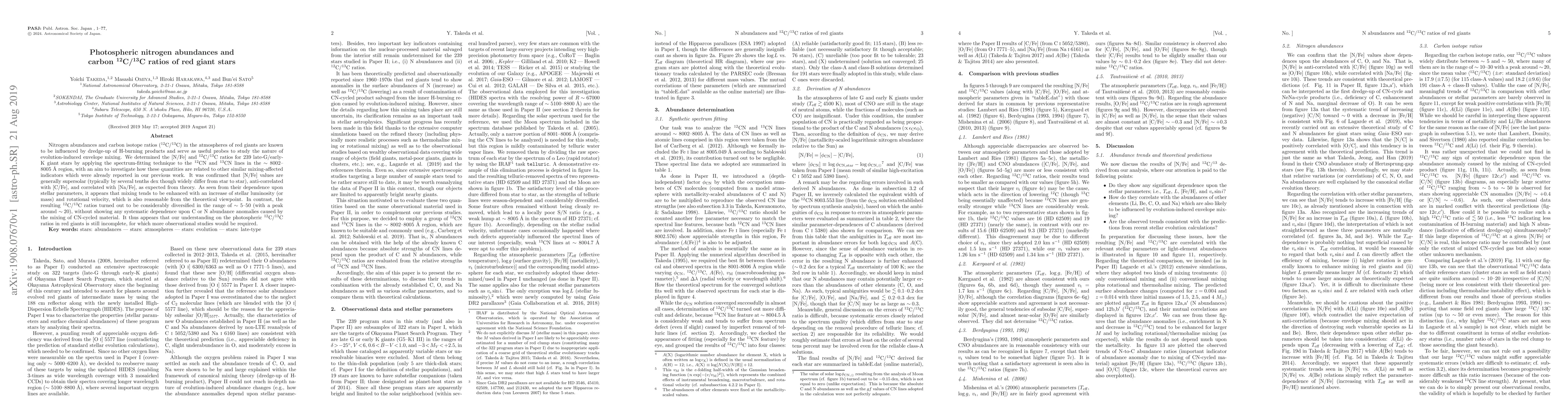 This study investigates nitrogen abundances and carbon isotope ratios in red giant stars, revealing supersolar nitrogen levels and a diverse range of carbon isotope ratios. The findings suggest enhanced mixing correlates with stellar luminosity and rotational velocity, but the carbon isotope ratios remain complex and not fully understood, necessitating further research.