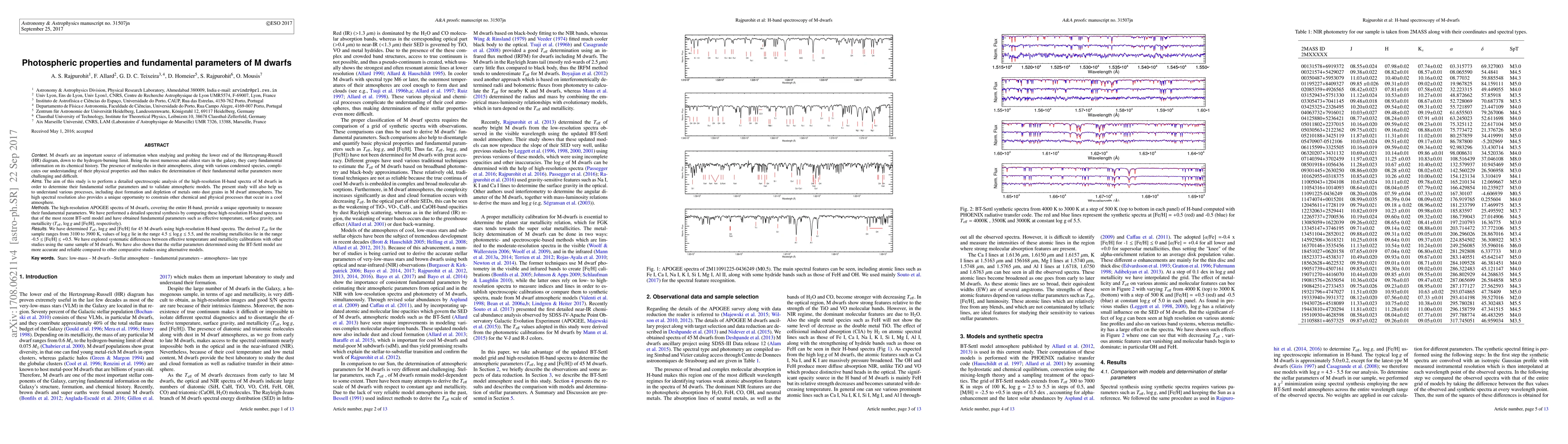 M dwarfs are an important source of information when studying and probing the lower end of the Hertzsprung-Russell (HR) diagram, down to the hydrogen-burning limit. Being the most numerous and oldest stars in the galaxy, they carry fundamental information on its chemical history. The presence of molecules in their atmospheres, along with various condensed species, complicates our understanding of their physical properties and thus makes the determination of their fundamental stellar parameters more challenging and difficult. The aim of this study is to perform a detailed spectroscopic analysis of the high-resolution H-band spectra of M dwarfs in order to determine their fundamental stellar parameters and to validate atmospheric models. The present study will also help us to understand various processes, including dust formation and depletion of metals onto dust grains in M dwarf atmospheres. The high spectral resolution also provides a unique opportunity to constrain other chemical and physical processes that occur in a cool atmosphere The high-resolution APOGEE spectra of M dwarfs, covering the entire H-band, provide a unique opportunity to measure their fundamental parameters. We have performed a detailed spectral synthesis by comparing these high-resolution H-band spectra to that of the most recent BT-settl model and have obtained fundamental parameters such as effective temperature, surface gravity, and metallicity (Teff, log g and [Fe/H]) respectively.