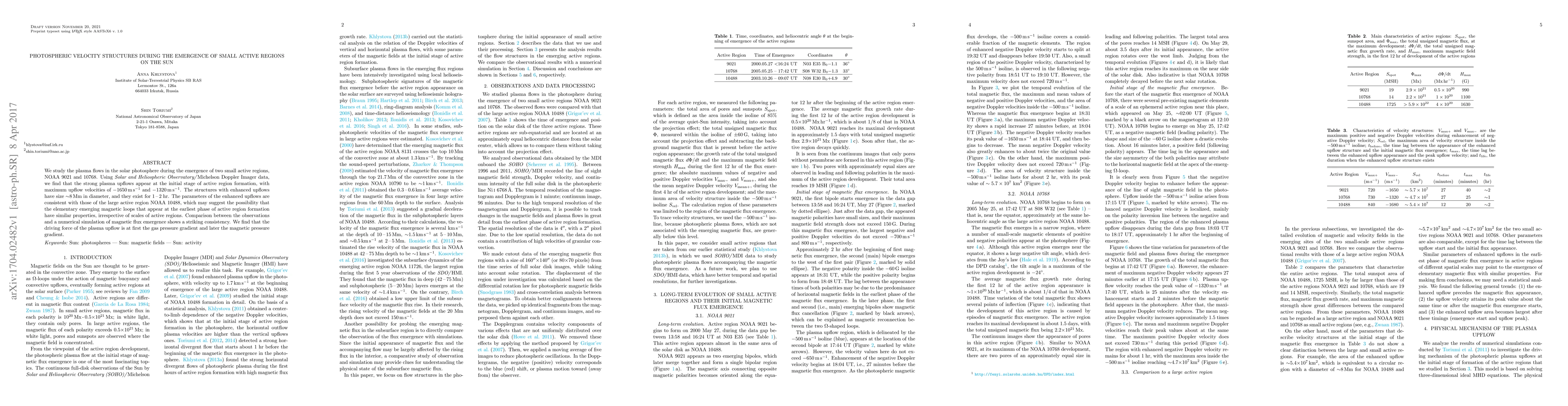 This study investigates plasma flows in the solar photosphere during the emergence of small active regions, finding strong upflows at the initial stage with velocities up to 1650 m/s. The upflow structures, about 8 Mm in diameter, last 1-2 hours and exhibit properties similar to those of larger active regions, suggesting common characteristics in emerging magnetic loops.