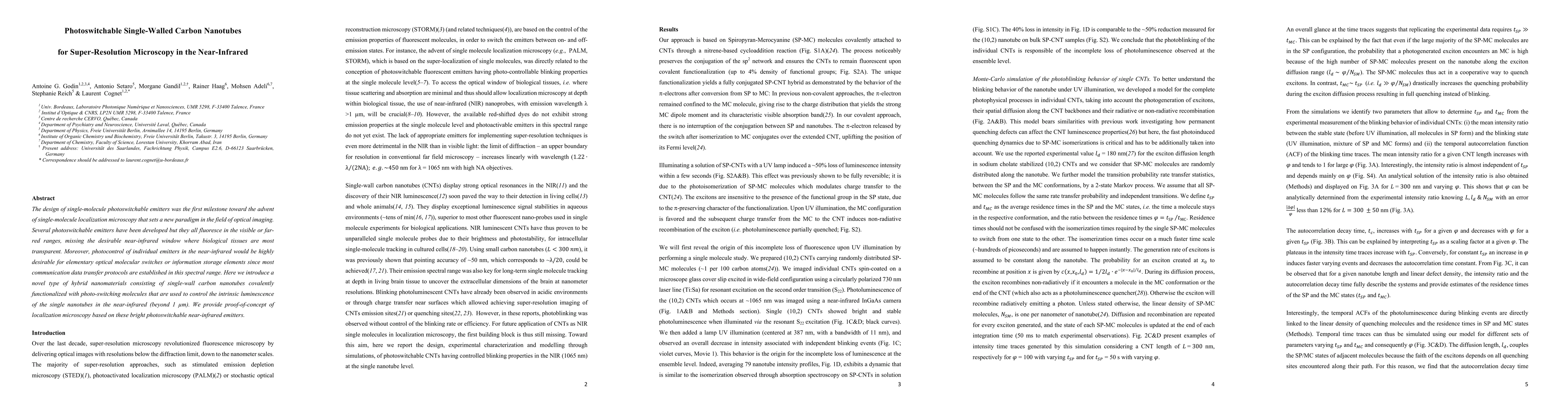 This research introduces photoswitchable single-walled carbon nanotubes for super-resolution microscopy in the near-infrared, overcoming the limitations of existing photoswitchable emitters that only work in visible or far-red ranges. The hybrid nanomaterials enable bright, photoswitchable near-infrared emitters, paving the way for advanced optical imaging techniques.