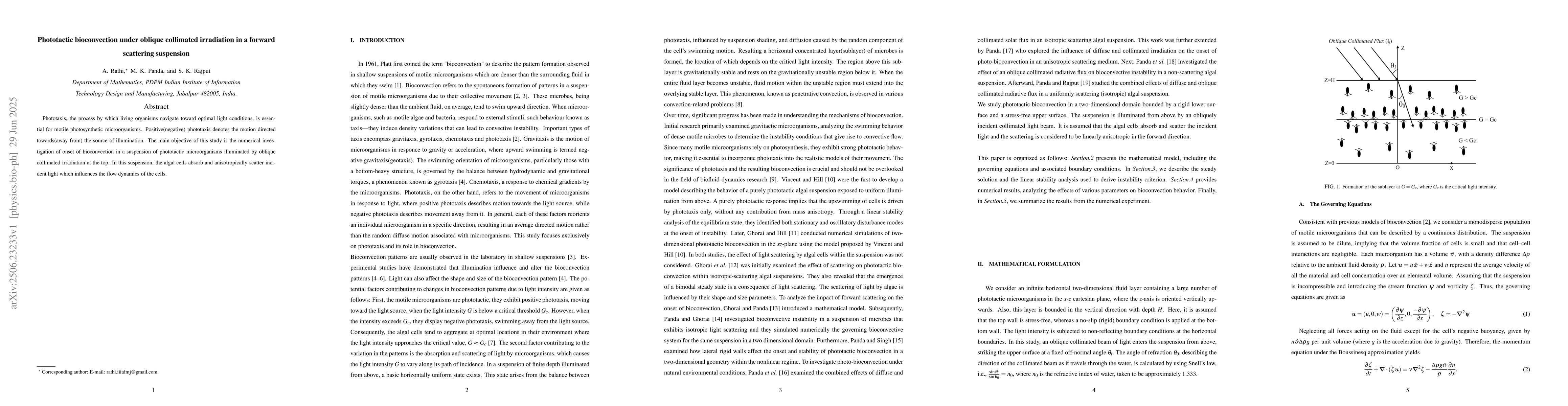 Phototaxis, the process by which living organisms navigate toward optimal light conditions, is essential for motile photosynthetic microorganisms. Positive(negative) phototaxis denotes the motion directed towards(away from) the source of illumination. The main objective of this study is the numerical investigation of onset of bioconvection in a suspension of phototactic microorganisms illuminated by oblique collimated irradiation at the top. In this suspension, the algal cells absorb and anisotropically scatter incident light which influences the flow dynamics of the cells.