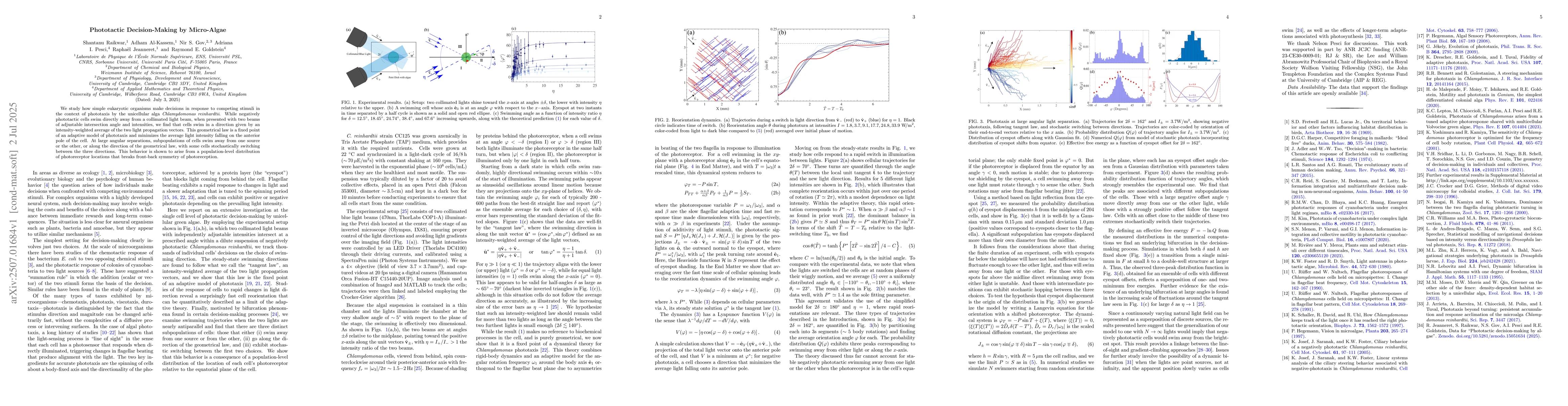 We study how simple eukaryotic organisms make decisions in response to competing stimuli in the context of phototaxis by the unicellular alga $Chlamydomonas~reinhardtii$. While negatively phototactic cells swim directly away from a collimated light beam, when presented with two beams of adjustable intersection angle and intensities, we find that cells swim in a direction given by an intensity-weighted average of the two light propagation vectors. This geometrical law is a fixed point of an adaptive model of phototaxis and minimizes the average light intensity falling on the anterior pole of the cell. At large angular separations, subpopulations of cells swim away from one source or the other, or along the direction of the geometrical law, with some cells stochastically switching between the three directions. This behavior is shown to arise from a population-level distribution of photoreceptor locations that breaks front-back symmetry of photoreception.