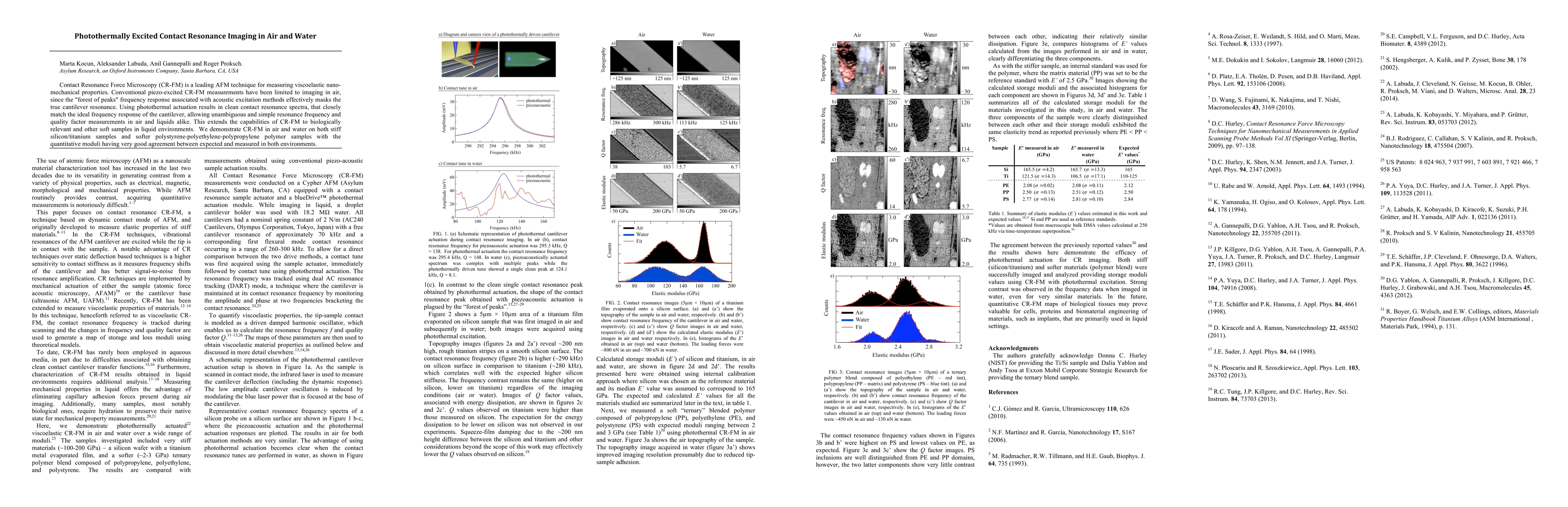 Contact Resonance Force Microscopy (CR-FM) is a leading AFM technique for measuring viscoelastic nano-mechanical properties. Conventional piezo-excited CR-FM measurements have been limited to imaging in air, since the "forest of peaks" frequency response associated with acoustic excitation methods effectively masks the true cantilever resonance. Using photothermal actuation results in clean contact resonance spectra, that closely match the ideal frequency response of the cantilever, allowing unambiguous and simple resonance frequency and quality factor measurements in air and liquids alike. This extends the capabilities of CR-FM to biologically relevant and other soft samples in liquid environments. We demonstrate CR-FM in air and water on both stiff silicon/titanium samples and softer polystyrene-polyethylene-polypropylene polymer samples with the quantitative moduli having very good agreement between expected and measured in both environments.