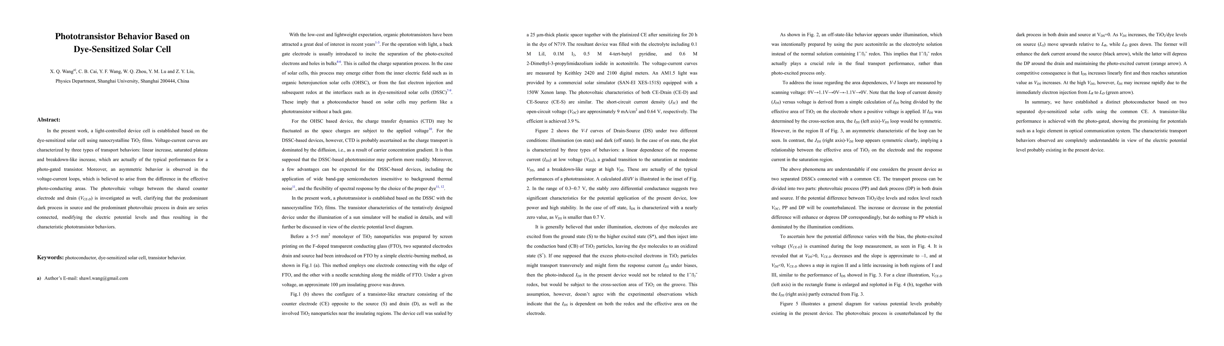 This paper investigates a dye-sensitized solar cell-based phototransistor utilizing nanocrystalline TiO2 films, revealing three distinct voltage-current transport behaviors. The asymmetric voltage-current loops suggest differences in effective photo-conducting areas, while the photovoltaic voltage analysis indicates series-connected dark and photovoltaic processes that modify electric potential levels, leading to unique phototransistor characteristics.
