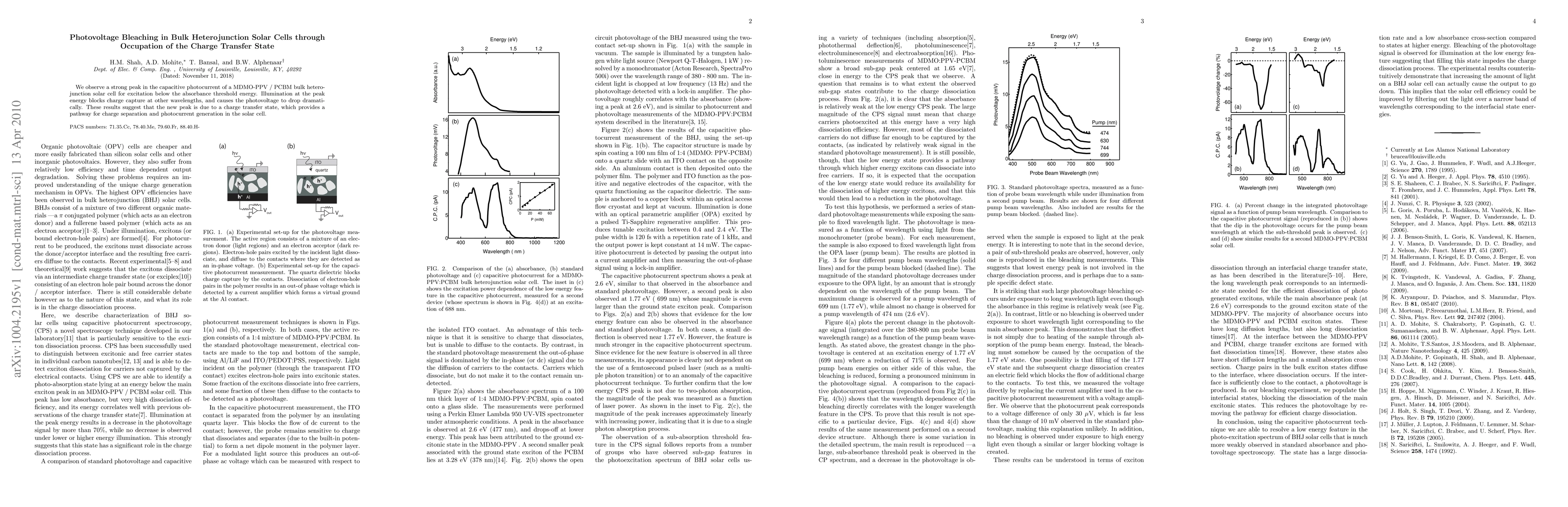 Summary: A strong peak in the capacitive photocurrent of a MDMO-PPV/PCBM bulk heterojunction solar cell below the absorbance threshold indicates the presence of a charge transfer state. This state blocks charge capture at other wavelengths, leading to a significant drop in photovoltage, suggesting its role in charge separation and photocurrent generation.