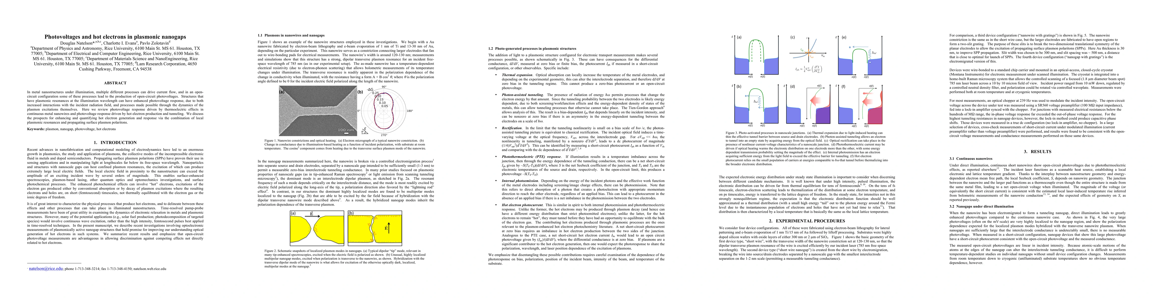 In metal nanostructures under illumination, multiple different processes can drive current flow, and in an open- circuit configuration some of these processes lead to the production of open-circuit photovoltages. Structures that have plasmonic resonances at the illumination wavelength can have enhanced photovoltage response, due to both increased interactions with the incident radiation field, and processes made possible through the dynamics of the plasmon excitations themselves. Here we review photovoltage response driven by thermoelectric effects in continuous metal nanowires and photovoltage response driven by hot electron production and tunneling. We discuss the prospects for enhancing and quantifying hot electron generation and response via the combination of local plasmonic resonances and propagating surface plasmon polaritons.
