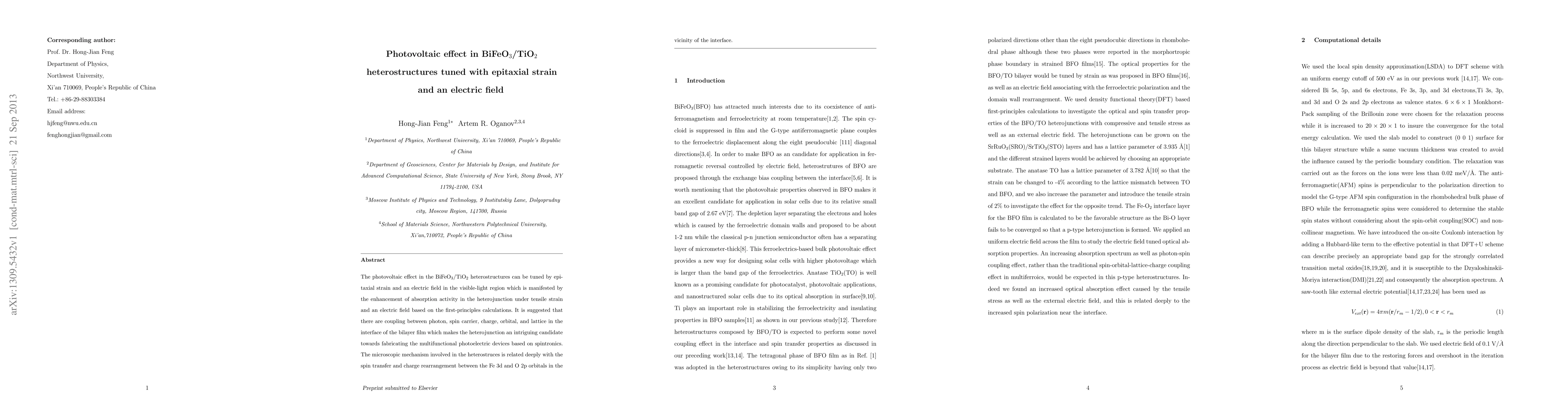 The photovoltaic effect in the BiFeO3/TiO2 heterostructures can be tuned by epitaxial strain and an electric field in the visible-light region which is manifested by the enhancement of absorption activity in the heterojunction under tensile strain and an electric field based on the first-principles calculations. It is suggested that there are coupling between photon, spin carrier, charge, orbital, and lattice in the interface of the bilayer film which makes the heterojunction an intriguing candidate towards fabricating the multifunctional photoelectric devices based on spintronics. The microscopic mechanism involved in the heterostruces is related deeply with the spin transfer and charge rearrangement between the Fe 3d and O 2p orbitals in the vicinity of the interface.