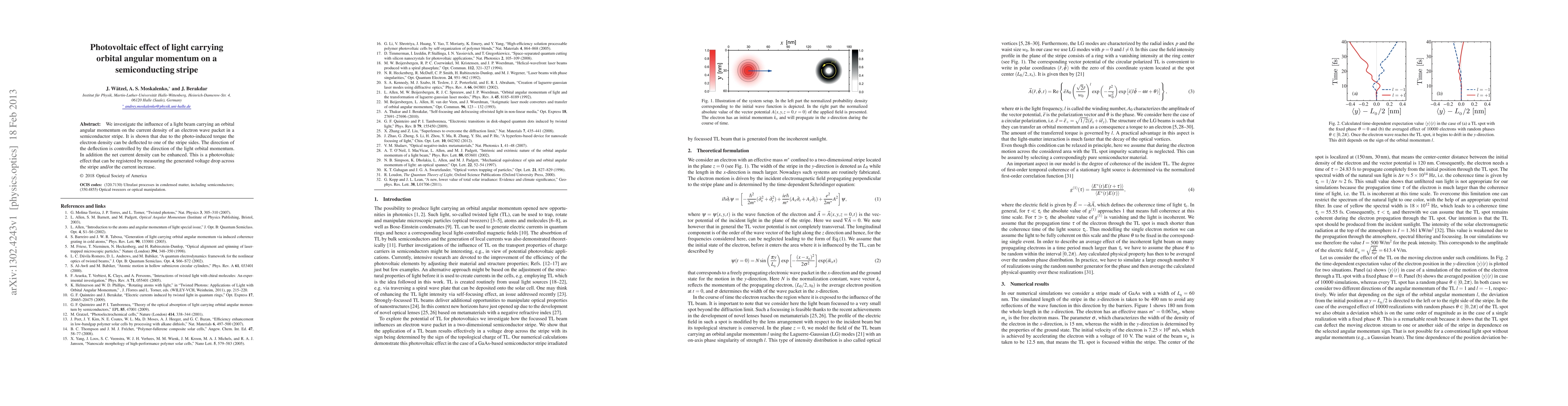 This study explores how light beams with orbital angular momentum affect the current density in a semiconductor stripe, demonstrating a photovoltaic effect where the electron density is deflected based on the light's orbital momentum, enhancing the net current density and generating a measurable voltage drop.