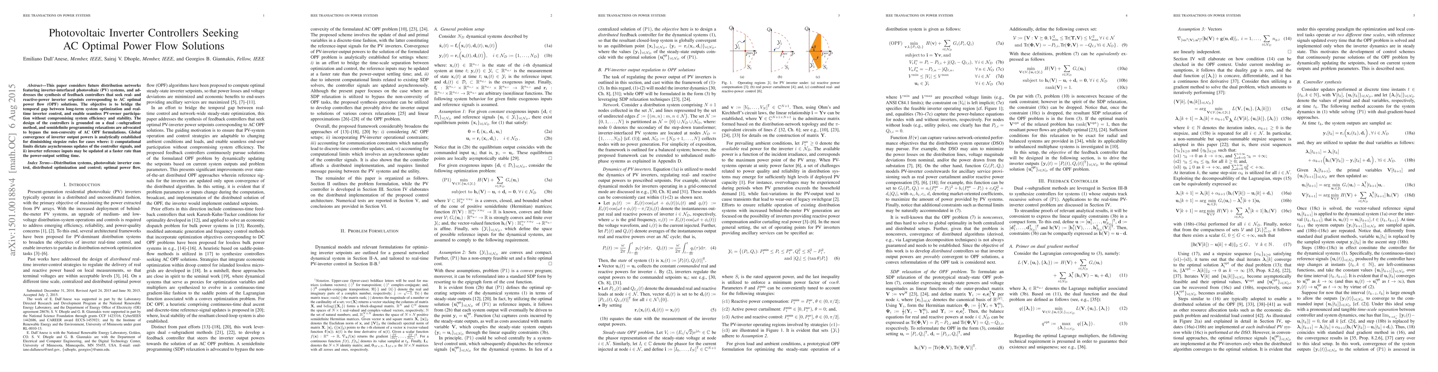 This paper considers future distribution networks featuring inverter-interfaced photovoltaic (PV) systems, and addresses the synthesis of feedback controllers that seek real- and reactive-power inverter setpoints corresponding to AC optimal power flow (OPF) solutions. The objective is to bridge the temporal gap between long-term system optimization and real-time inverter control, and enable seamless PV-owner participation without compromising system efficiency and stability. The design of the controllers is grounded on a dual epsilon-subgradient method, and semidefinite programming relaxations are advocated to bypass the non-convexity of AC OPF formulations. Global convergence of inverter output powers is analytically established for diminishing stepsize rules and strictly convex OPF costs for cases where: i) computational limits dictate asynchronous updates of the controller signals, and ii) inverter reference inputs may be updated at a faster rate than the power-output settling time. Although the focus is on PV systems, the framework naturally accommodates different types of inverter-interfaced energy resources.