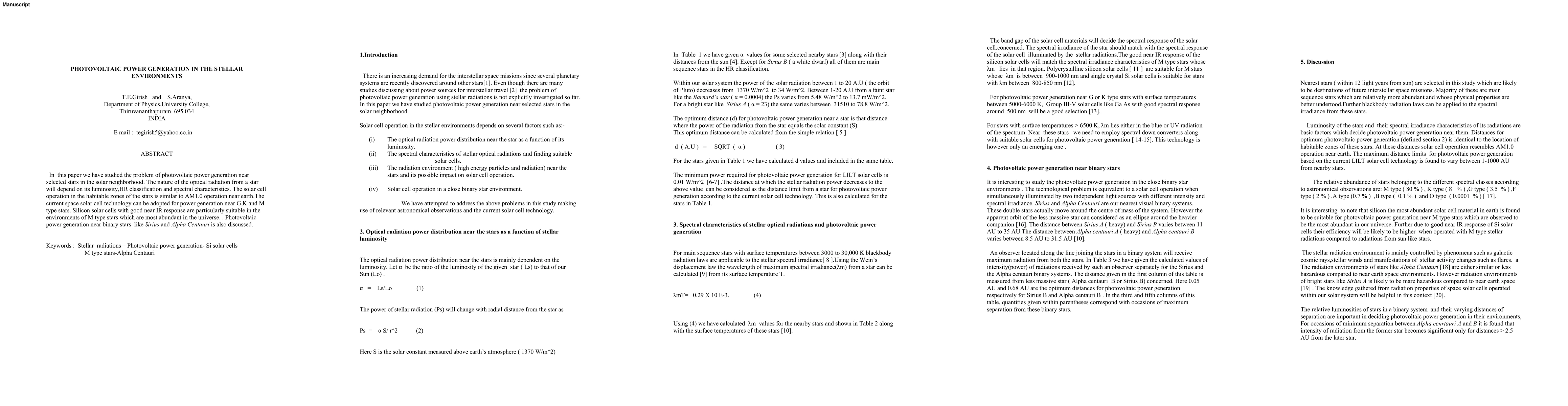 This paper investigates photovoltaic power generation near stars in the solar neighborhood, highlighting the suitability of current space solar cell technology for G, K, and M type stars, with a focus on silicon solar cells for M type stars. It also discusses the challenges and opportunities for power generation near binary stars like Sirius and Alpha Centauri.