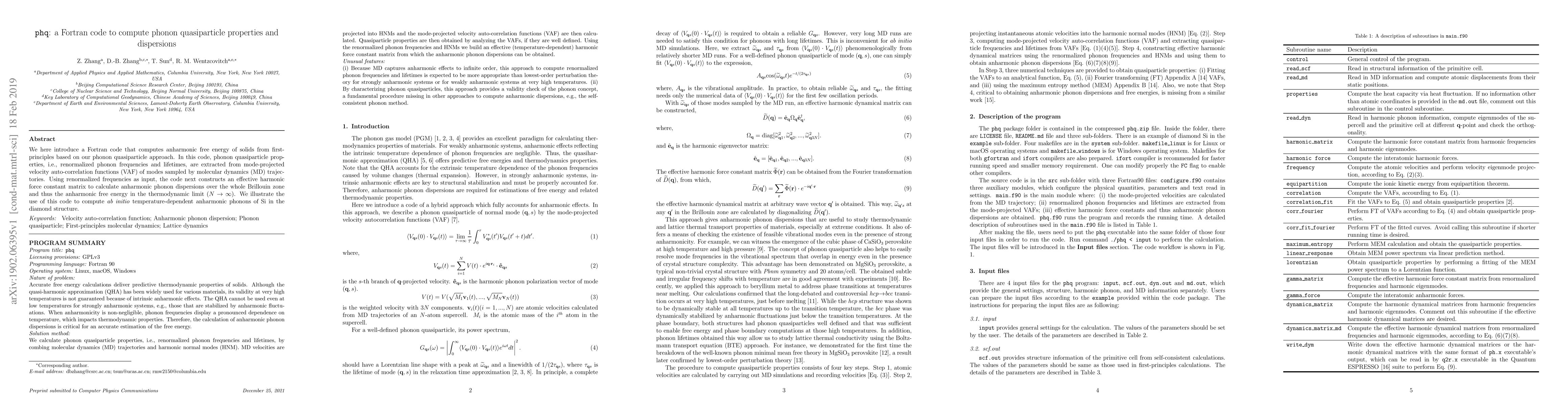 This paper introduces a Fortran code named PHQ for computing phonon quasiparticle properties and dispersions, which calculates anharmonic free energy from first-principles using phonon quasiparticle approach and renormalized phonon frequencies derived from velocity auto-correlation functions. The code is demonstrated by computing the temperature-dependent anharmonic phonons in silicon.