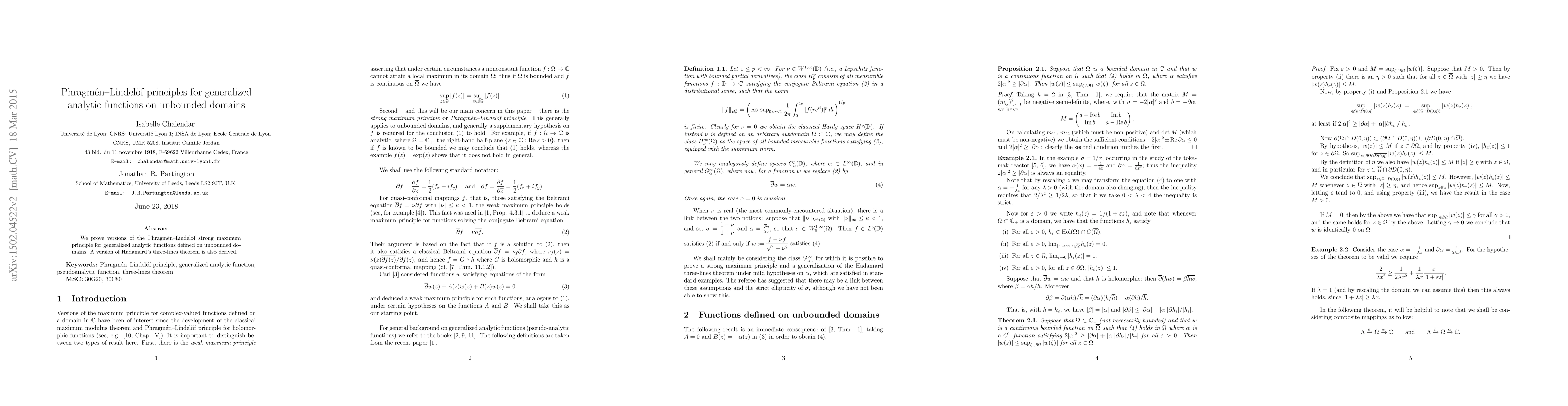 Summary: This paper establishes Phragm\'en--Lindel\"of principles for generalized analytic functions on unbounded domains and derives a version of Hadamard's three-lines theorem for these functions.