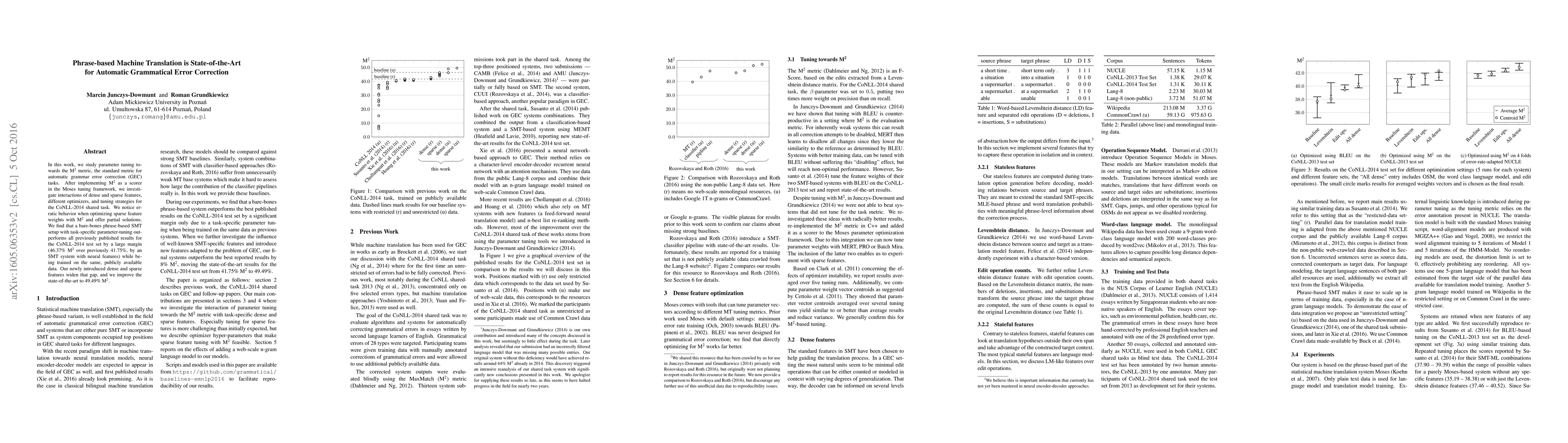 In this work, we study parameter tuning towards the M^2 metric, the standard metric for automatic grammar error correction (GEC) tasks. After implementing M^2 as a scorer in the Moses tuning framework, we investigate interactions of dense and sparse features, different optimizers, and tuning strategies for the CoNLL-2014 shared task. We notice erratic behavior when optimizing sparse feature weights with M^2 and offer partial solutions. We find that a bare-bones phrase-based SMT setup with task-specific parameter-tuning outperforms all previously published results for the CoNLL-2014 test set by a large margin (46.37% M^2 over previously 41.75%, by an SMT system with neural features) while being trained on the same, publicly available data. Our newly introduced dense and sparse features widen that gap, and we improve the state-of-the-art to 49.49% M^2.