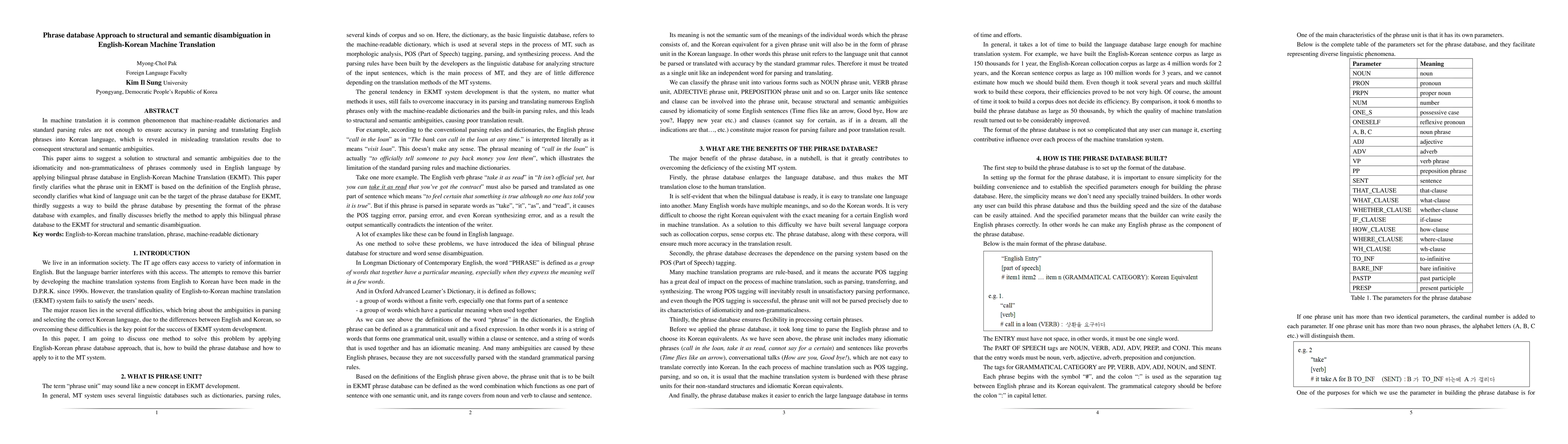 This paper proposes using a bilingual phrase database to address structural and semantic ambiguities in English-Korean machine translation, focusing on idiomatic and non-grammatical phrases. It outlines the construction and application of this database to improve translation accuracy.