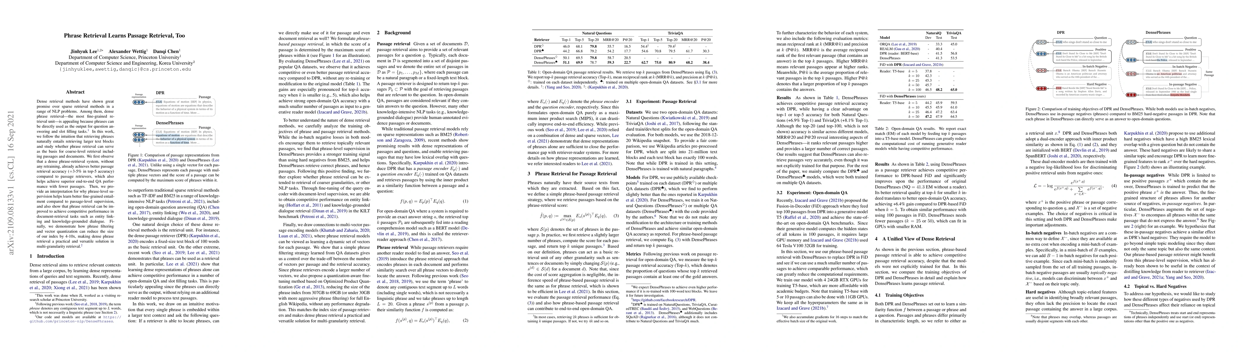 This paper investigates the effectiveness of dense phrase retrieval for coarse-level passage and document retrieval, finding that phrase retrieval can naturally improve passage retrieval accuracy and end-to-end QA performance, while also being scalable through techniques like phrase filtering and vector quantization.