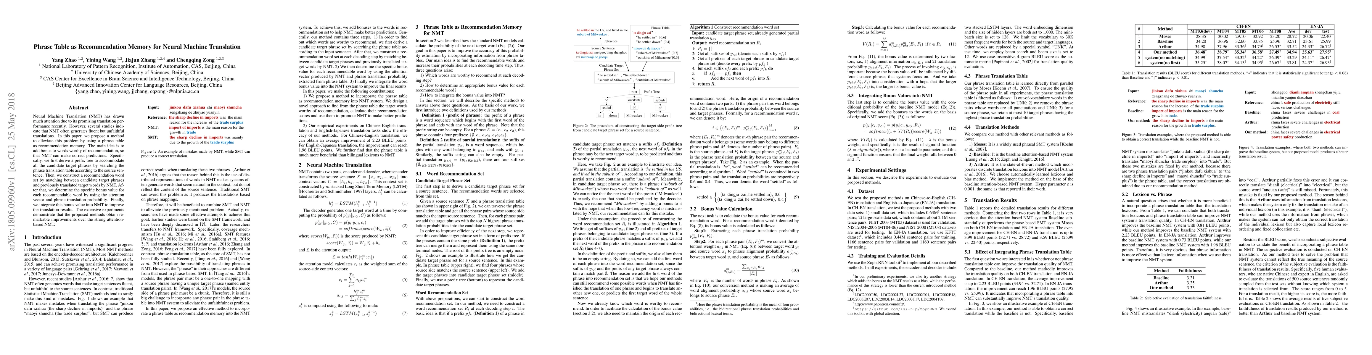 This paper proposes using a phrase table as recommendation memory to improve Neural Machine Translation (NMT) by adding bonuses to recommendable words, enhancing the model's ability to generate faithful translations. Experiments show significant improvements over strong attention-based NMT models.