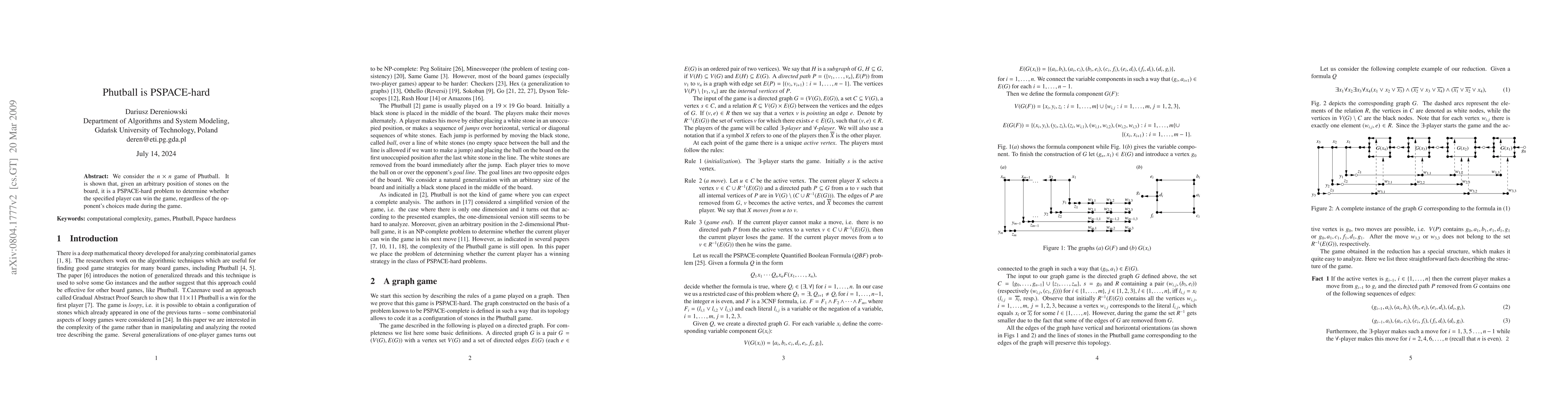 Summary: The paper demonstrates that determining a winning strategy for the game Phutball, given any initial configuration of stones, is a PSPACE-hard problem, indicating its computational complexity. This implies that Phutball shares the same level of difficulty as the most challenging problems solvable by polynomial space.