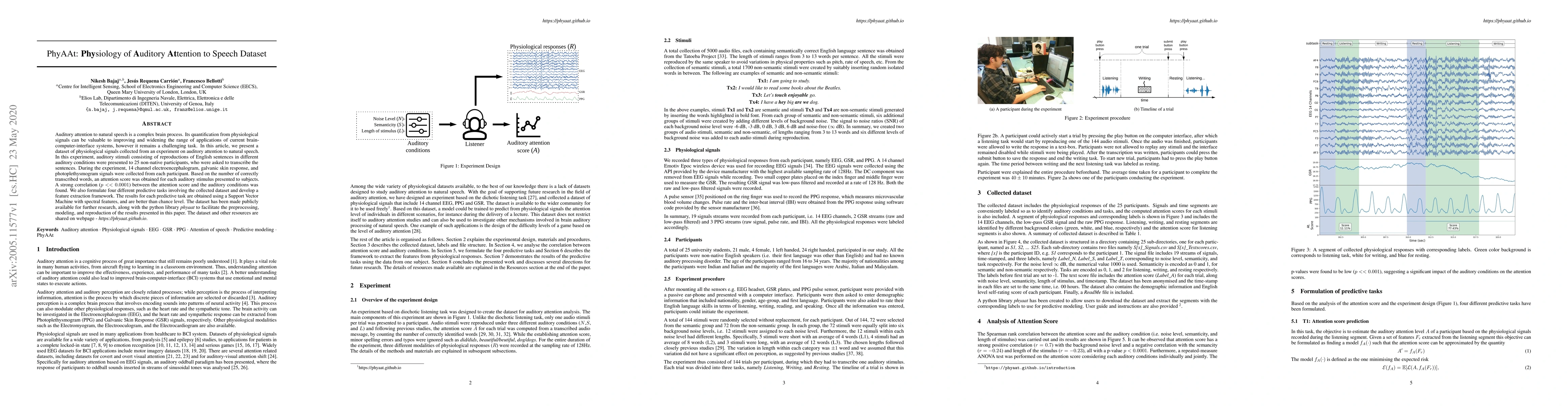 This paper introduces a dataset of physiological signals collected during an experiment on auditory attention to natural speech, aiming to enhance brain-computer interface systems. The dataset includes EEG, GSR, and PPG signals from 25 non-native participants, and provides a correlation between attention scores and auditory conditions. Predictive tasks using SVM with spectral features show results better than chance, and the dataset is publicly available with a Python library for further research.