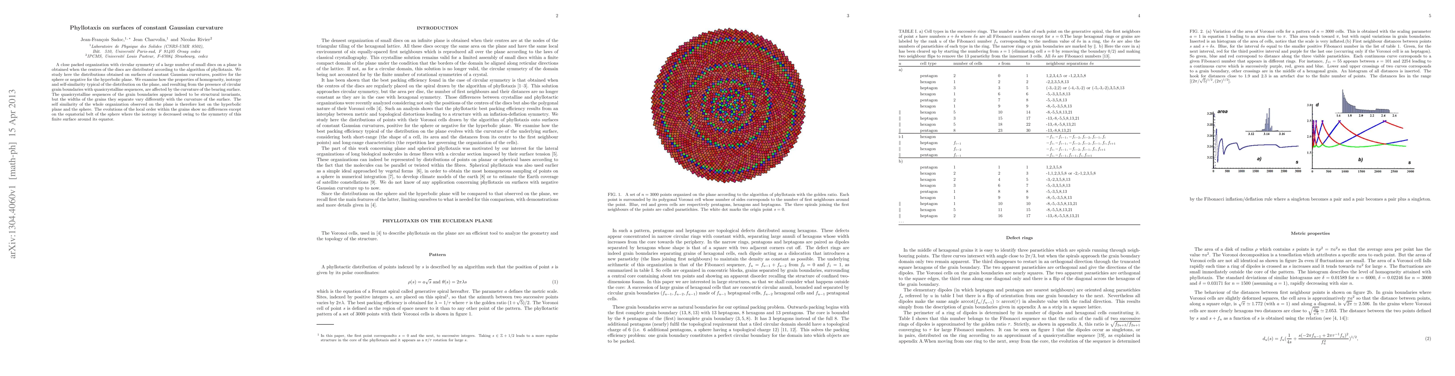 A close packed organization with circular symmetry of a large number of small discs on a plane is obtained when the centres of the discs are distributed according to the algorithm of phyllotaxis. We study here the distributions obtained on surfaces of constant Gaussian curvatures, positive for the sphere or negative for the hyperbolic plane. We examine how the properties of homogeneity, isotropy and self-similarity typical of the distribution on the plane, and resulting from the presence of circular grain boundaries with quasicrystalline sequences, are affected by the curvature of the bearing surface. The quasicrystalline sequences of the grain boundaries appear indeed to be structural invariants, but the widths of the grains they separate vary differently with the curvature of the surface. The self similarity of the whole organization observed on the plane is therefore lost on the hyperbolic plane and the sphere. The evolutions of the local order within the grains show no differences except on the equatorial belt of the sphere where the isotropy is decreased owing to the symmetry of this finite surface around its equator.