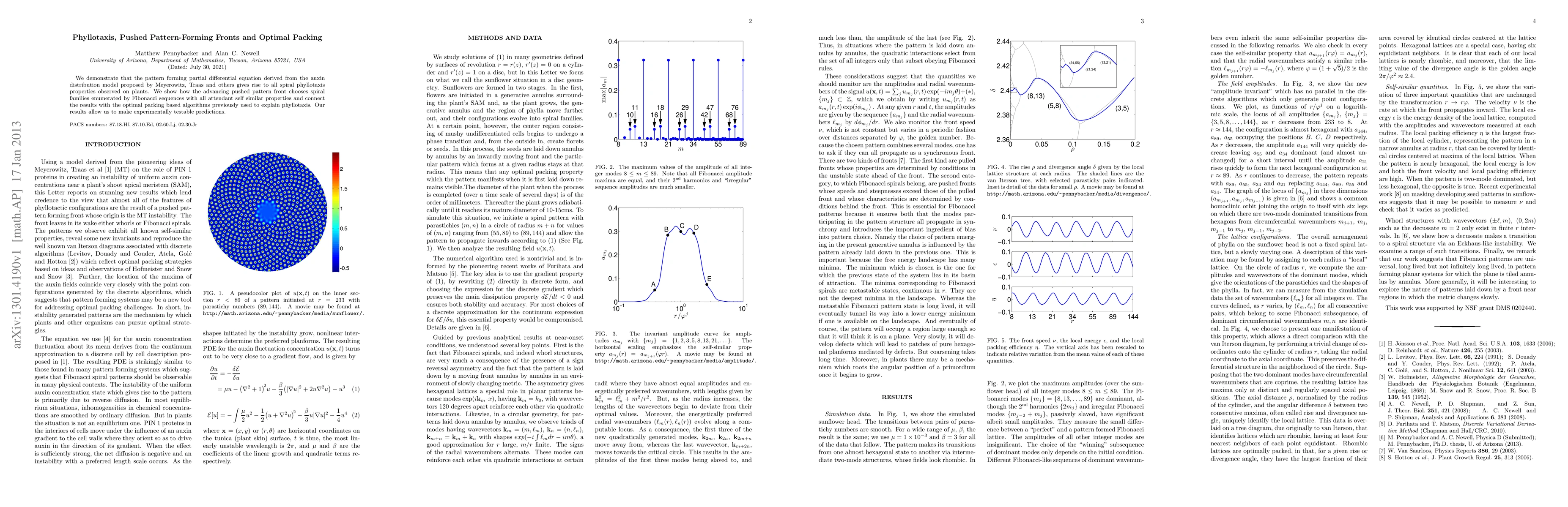 This paper shows that a partial differential equation from the auxin distribution model explains spiral phyllotaxis in plants, demonstrating how the pattern-forming front selects Fibonacci-sequenced spirals, and connects these findings to optimal packing algorithms, providing testable predictions.