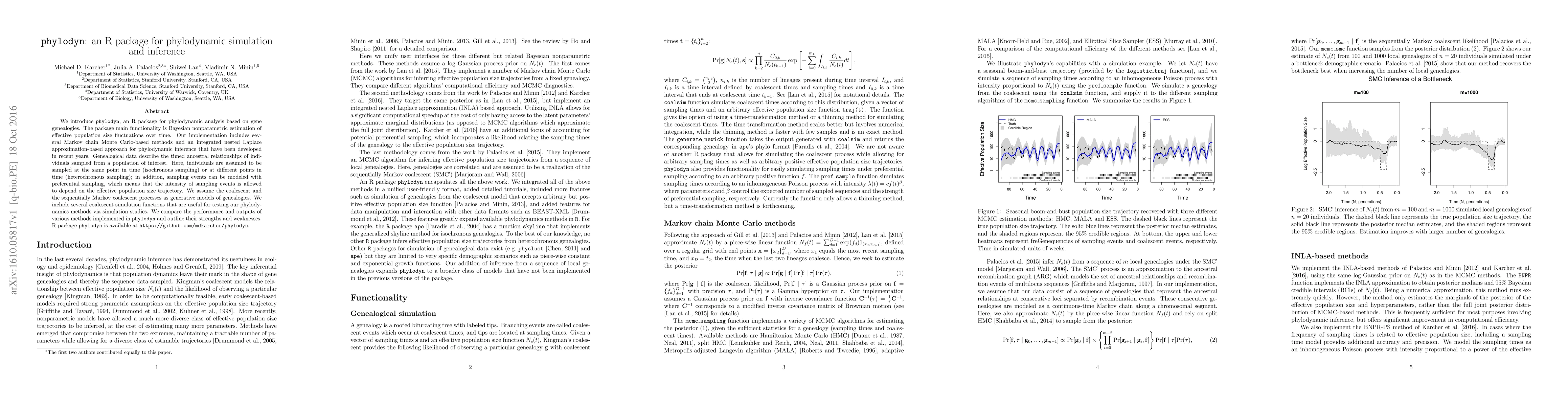 PhyLodyn is an R package for phylodynamic analysis, offering Bayesian nonparametric estimation of population size changes over time. It includes MCMC and INLA-based methods for inferring genealogies and simulating coalescent processes for testing.