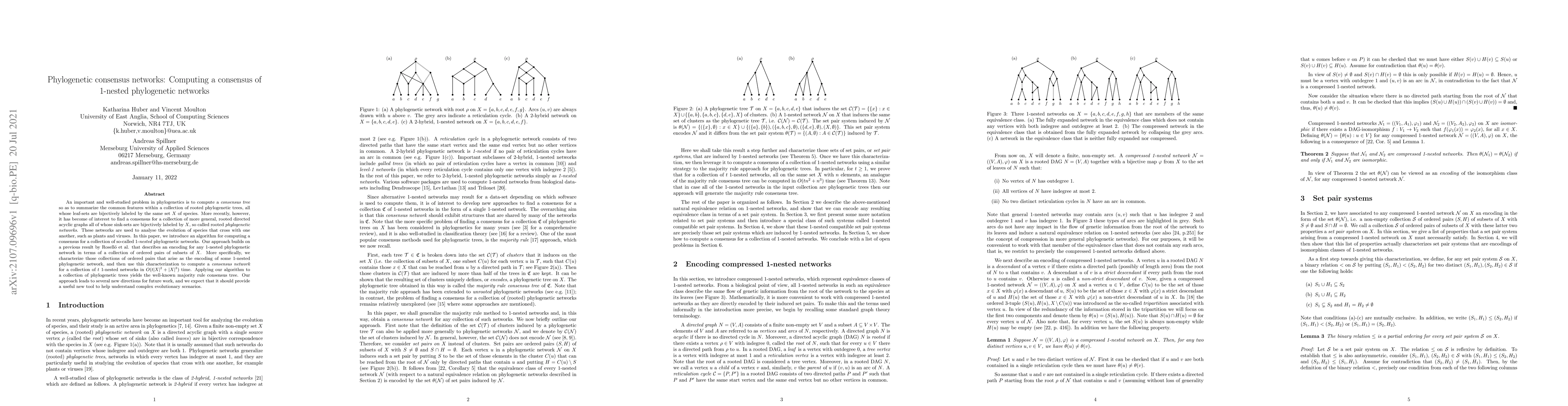 An important and well-studied problem in phylogenetics is to compute a \emph{consensus tree} so as to summarize the common features within a collection of rooted phylogenetic trees, all whose leaf-sets are bijectively labeled by the same set~(X) of species. More recently, however, it has become of interest to find a consensus for a collection of more general, rooted directed acyclic graphs all of whose sink-sets are bijectively labeled by~(X), so called rooted \emph{phylogenetic networks}. These networks are used to analyse the evolution of species that cross with one another, such as plants and viruses. In this paper, we introduce an algorithm for computing a consensus for a collection of so-called 1-\emph{nested} phylogenetic networks. Our approach builds on a previous result by Rosell\'o et al. that describes an encoding for any 1-nested phylogenetic network in terms of a collection of ordered pairs of subsets of (X).More specifically, we characterize those collections of ordered pairs that arise as the encoding of some 1-nested phylogenetic network, and then use this characterization to compute a \emph{consensus network} for a collection of~$t$ 1-nested networks in $O(t|X|^2+|X|^3)$ time. Applying our algorithm to a collection of phylogenetic trees yields the well-known majority rule consensus tree. Our approach leads to several new directions for futurework, and we expect that it should provide a useful new tool to help understand complex evolutionary scenarios.