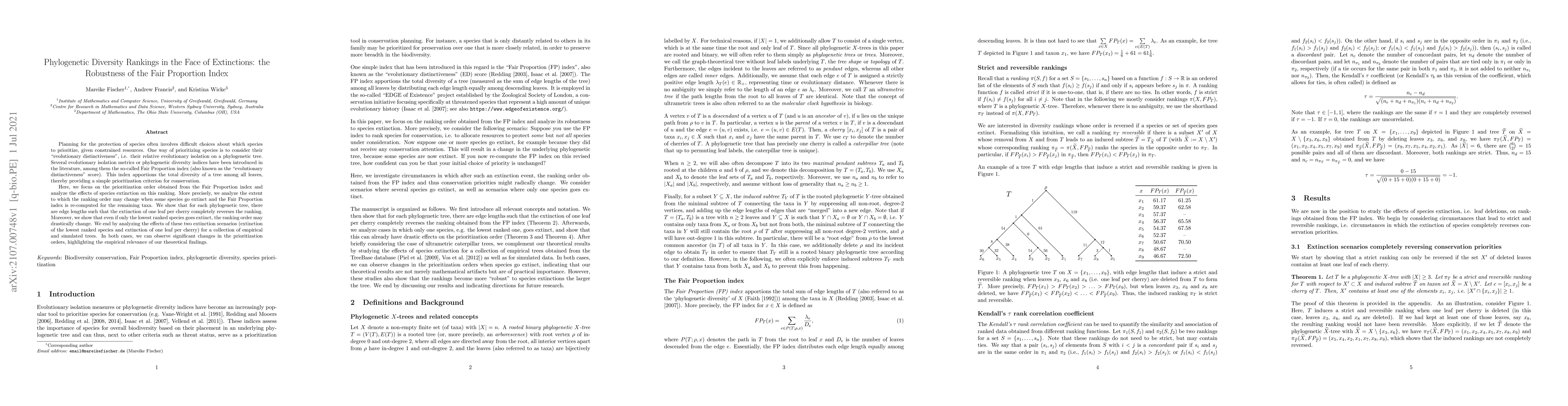 This paper examines how the Fair Proportion index, a metric for prioritizing species based on evolutionary distinctiveness, is affected by species extinctions. It finds that even minor extinctions, such as the lowest ranked species, can drastically alter the prioritization order, indicating the index's sensitivity and the need for robust conservation strategies.