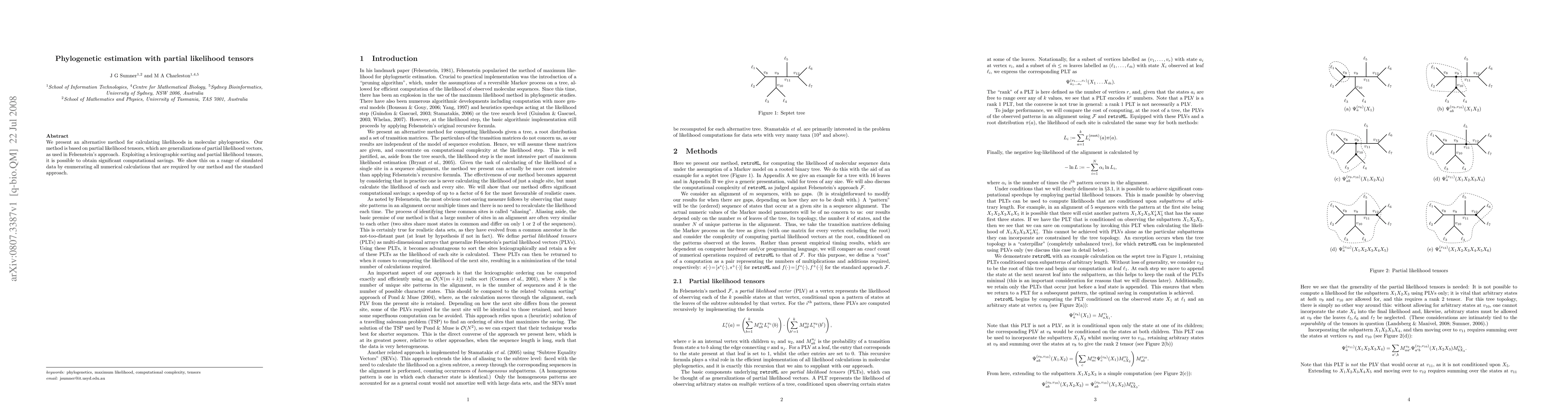 This paper introduces a new method for calculating likelihoods in molecular phylogenetics using partial likelihood tensors, which generalizes Felsenstein's approach. The method achieves significant computational savings through lexicographic sorting and tensor calculations, demonstrated via comparisons with standard methods on simulated data.