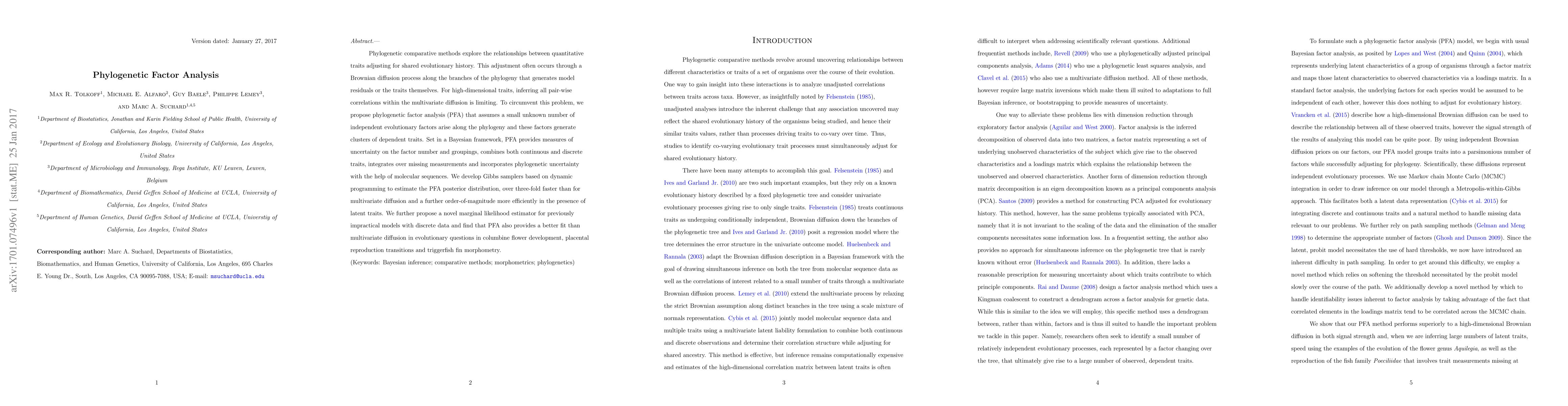 Phylogenetic Factor Analysis (PFA) is a new method that uses Bayesian modeling to identify independent evolutionary factors driving high-dimensional traits. PFA provides better fits than traditional methods in various evolutionary studies.