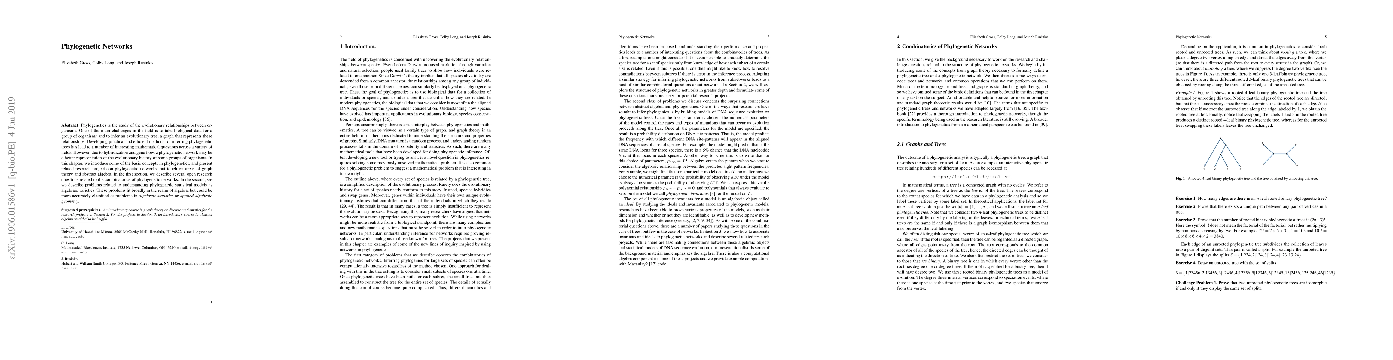 Phylogenetics is the study of the evolutionary relationships between organisms. One of the main challenges in the field is to take biological data for a group of organisms and to infer an evolutionary tree, a graph that represents these relationships. Developing practical and efficient methods for inferring phylogenetic trees has lead to a number of interesting mathematical questions across a variety of fields. However, due to hybridization and gene flow, a phylogenetic network may be a better representation of the evolutionary history of some groups of organisms. In this chapter, we introduce some of the basic concepts in phylogenetics, and present related undergraduate research projects on phylogenetic networks that touch on areas of graph theory and abstract algebra. In the first section, we describe several open research questions related to the combinatorics of phylogenetic networks. In the second, we describe problems related to understanding phylogenetic statistical models as algebraic varieties.