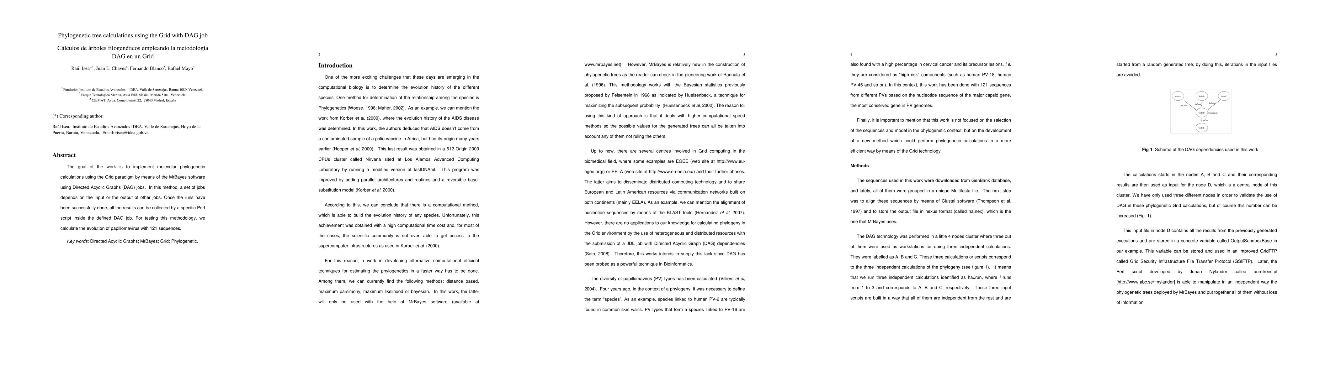 The goal of the work is to implement molecular phylogenetic calculations using the Grid paradigm by means of the MrBayes software using Directed Acyclic Graphs (DAG) jobs. In this method, a set of jobs depends on the input or the output of other jobs. Once the runs have been successfully done, all the results can be collected by a specific Perl script inside the defined DAG job. For testing this methodology, we calculate the evolution of papillomavirus with 121 sequences.