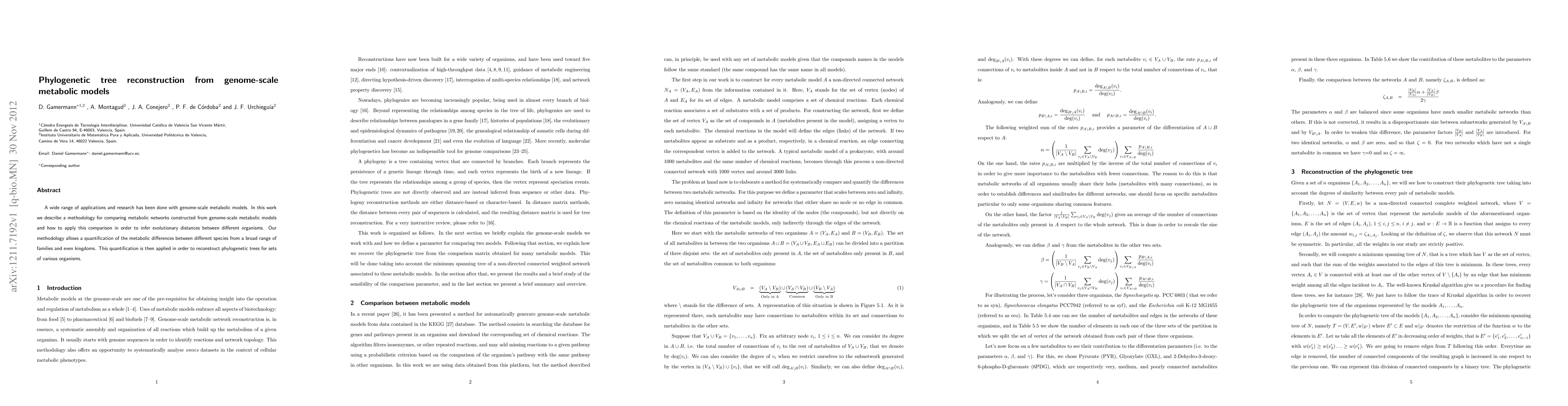 This paper proposes a methodology to compare metabolic networks derived from genome-scale metabolic models to infer evolutionary distances and reconstruct phylogenetic trees across different organisms, quantifying metabolic differences to enhance phylogenetic analysis.