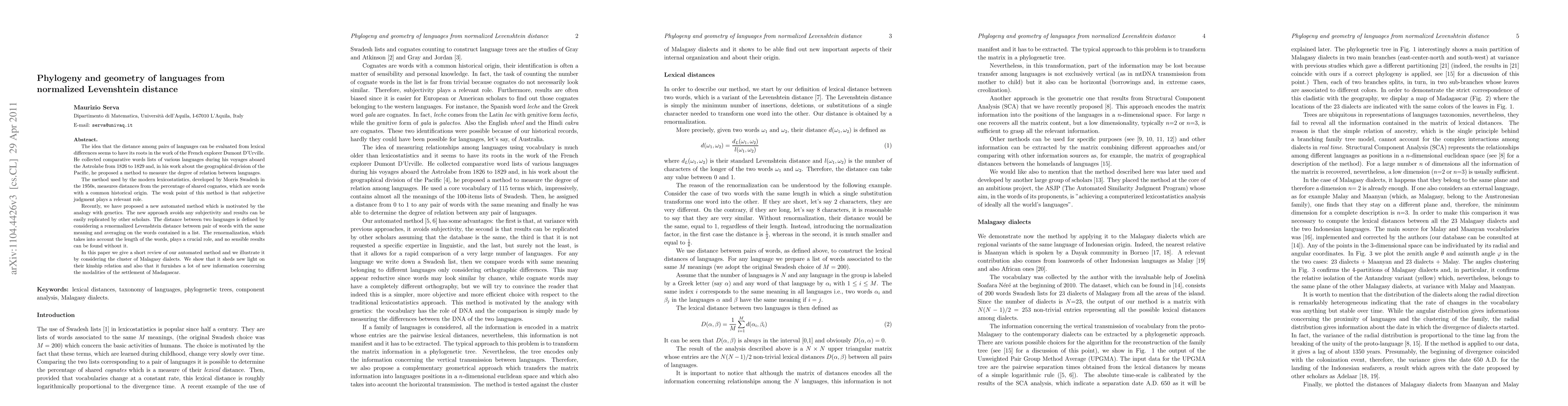 The idea that the distance among pairs of languages can be evaluated from lexical differences seems to have its roots in the work of the French explorer Dumont D'Urville. He collected comparative words lists of various languages during his voyages aboard the Astrolabe from 1826 to 1829 and, in his work about the geographical division of the Pacific, he proposed a method to measure the degree of relation between languages. The method used by the modern lexicostatistics, developed by Morris Swadesh in the 1950s, measures distances from the percentage of shared cognates, which are words with a common historical origin. The weak point of this method is that subjective judgment plays a relevant role. Recently, we have proposed a new automated method which is motivated by the analogy with genetics. The new approach avoids any subjectivity and results can be easily replicated by other scholars. The distance between two languages is defined by considering a renormalized Levenshtein distance between pair of words with the same meaning and averaging on the words contained in a list. The renormalization, which takes into account the length of the words, plays a crucial role, and no sensible results can be found without it. In this paper we give a short review of our automated method and we illustrate it by considering the cluster of Malagasy dialects. We show that it sheds new light on their kinship relation and also that it furnishes a lot of new information concerning the modalities of the settlement of Madagascar.