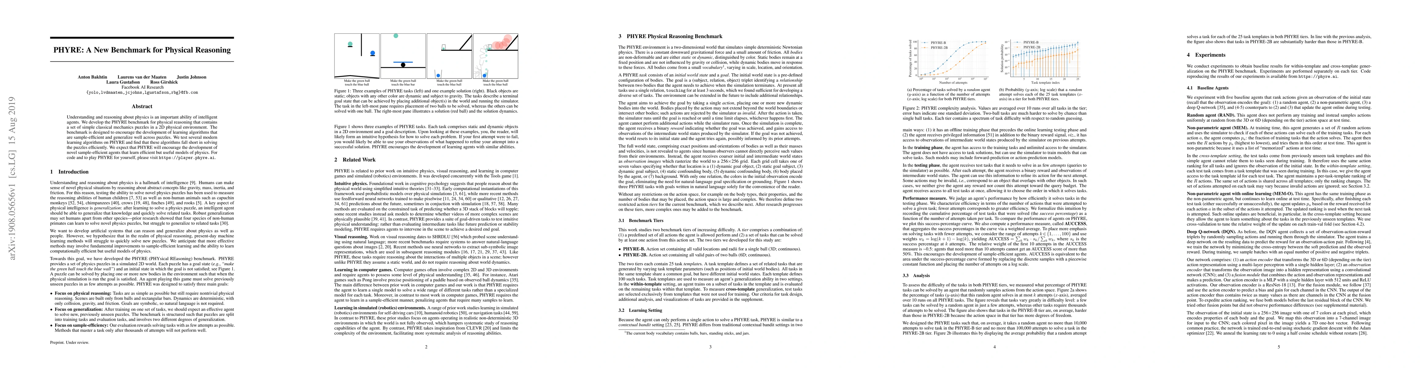 The PHYRE benchmark tests physical reasoning through simple classical mechanics puzzles in a 2D environment, aiming to foster the development of sample-efficient and generalizable learning algorithms. Current algorithms struggle to solve these puzzles efficiently, highlighting the need for novel approaches.
