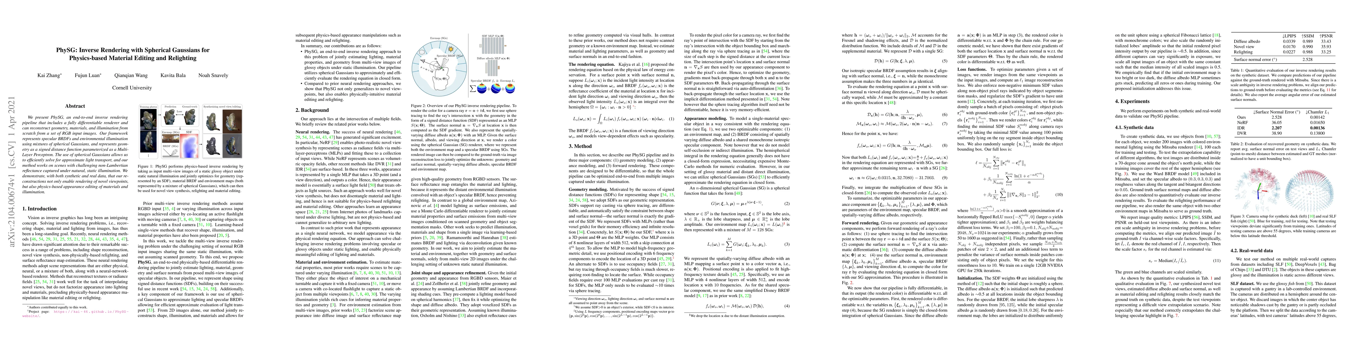 PhySG is an inverse rendering pipeline that reconstructs geometry, materials, and illumination from RGB images using spherical Gaussians for light transport. It enables physics-based editing and relighting of materials and illumination, demonstrated on both synthetic and real data.