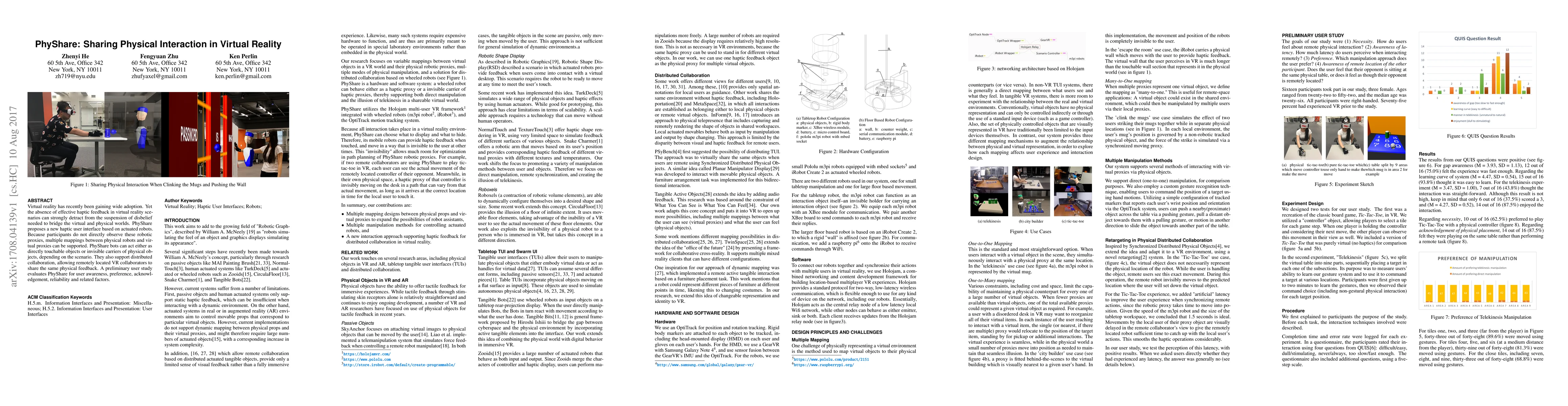 PhyShare is a haptic user interface using actuated robots to bridge virtual and physical worlds in VR, enabling distributed collaboration and multiple mappings between physical robots and virtual proxies for enhanced sensory experience. It supports both directly touchable objects and invisible carriers of physical objects in various scenarios.
