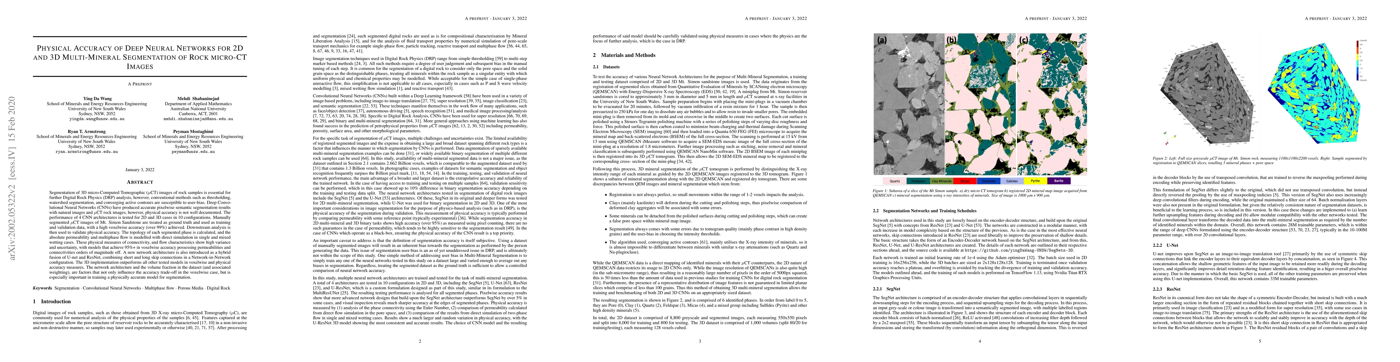 Segmentation of 3D micro-Computed Tomographic uCT) images of rock samples is essential for further Digital Rock Physics (DRP) analysis, however, conventional methods such as thresholding, watershed segmentation, and converging active contours are susceptible to user-bias. Deep Convolutional Neural Networks (CNNs) have produced accurate pixelwise semantic segmentation results with natural images and $\mu$CT rock images, however, physical accuracy is not well documented. The performance of 4 CNN architectures is tested for 2D and 3D cases in 10 configurations. Manually segmented uCT images of Mt. Simon Sandstone are treated as ground truth and used as training and validation data, with a high voxelwise accuracy (over 99%) achieved. Downstream analysis is then used to validate physical accuracy. The topology of each segmented phase is calculated, and the absolute permeability and multiphase flow is modelled with direct simulation in single and mixed wetting cases. These physical measures of connectivity, and flow characteristics show high variance and uncertainty, with models that achieve 95\%+ in voxelwise accuracy possessing permeabilities and connectivities orders of magnitude off. A new network architecture is also introduced as a hybrid fusion of U-net and ResNet, combining short and long skip connections in a Network-in-Network configuration. The 3D implementation outperforms all other tested models in voxelwise and physical accuracy measures. The network architecture and the volume fraction in the dataset (and associated weighting), are factors that not only influence the accuracy trade-off in the voxelwise case, but is especially important in training a physically accurate model for segmentation.