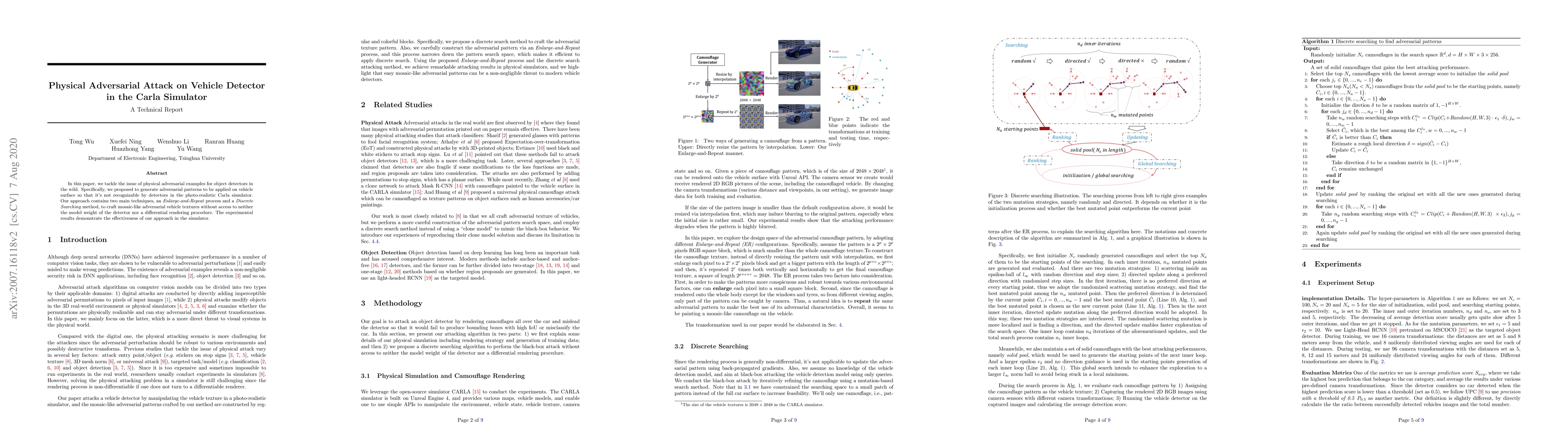 In this paper, we tackle the issue of physical adversarial examples for object detectors in the wild. Specifically, we proposed to generate adversarial patterns to be applied on vehicle surface so that it's not recognizable by detectors in the photo-realistic Carla simulator. Our approach contains two main techniques, an Enlarge-and-Repeat process and a Discrete Searching method, to craft mosaic-like adversarial vehicle textures without access to neither the model weight of the detector nor a differential rendering procedure. The experimental results demonstrate the effectiveness of our approach in the simulator.