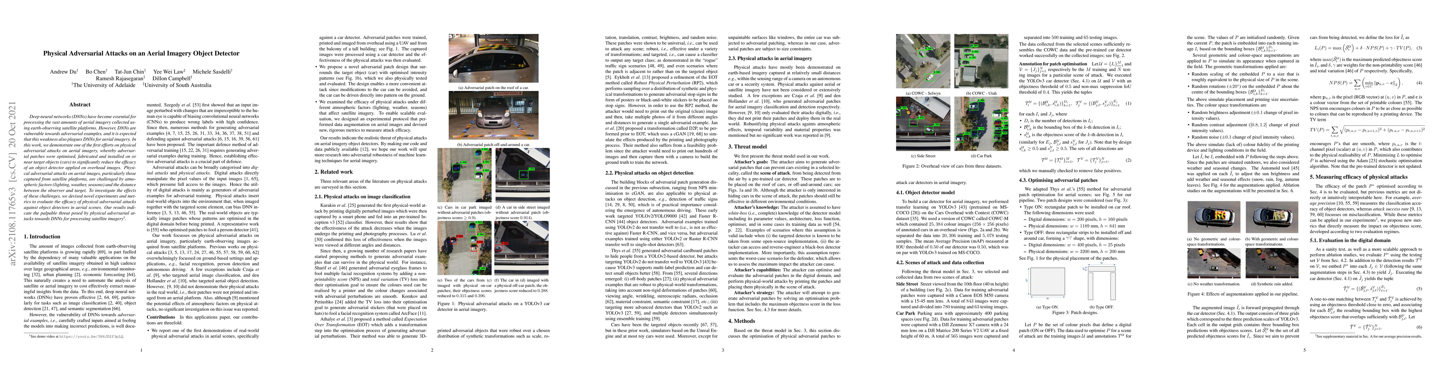 This paper investigates physical adversarial attacks on aerial imagery object detectors, demonstrating how optimized patches can be fabricated and placed on target objects to reduce detection efficacy. The study introduces novel experiments and metrics to evaluate these attacks under atmospheric and distance challenges, highlighting the significant threat they pose to DNNs processing satellite imagery.